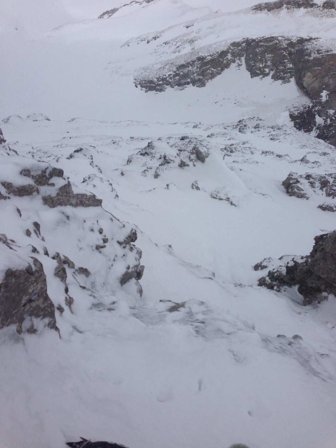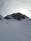 Im Zustieg ist die Querung über der Steilstufe gefrohren --> Harscheisen von Vorteil.