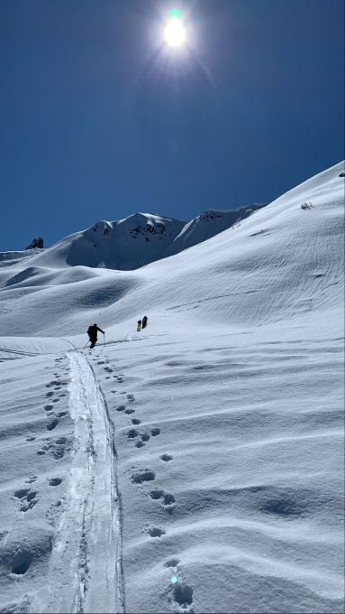 Aufgrund dem das der Skibetrieb in der Schweiz eingestellt ist, viele Tourengeher unterwegs. Der Bus fast leer, dafür der Parkplatz überfüllt.