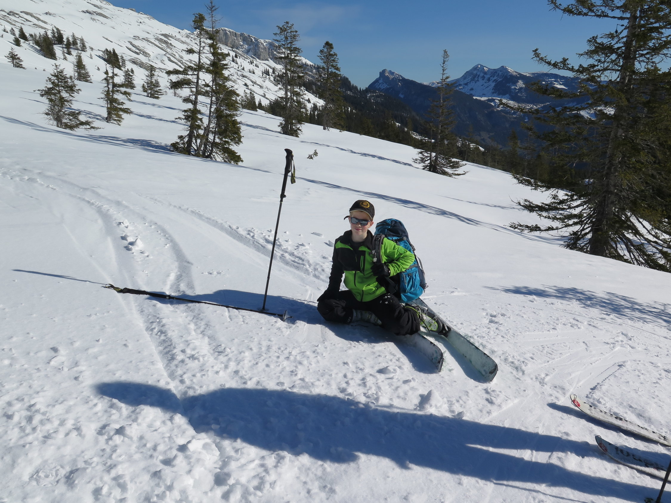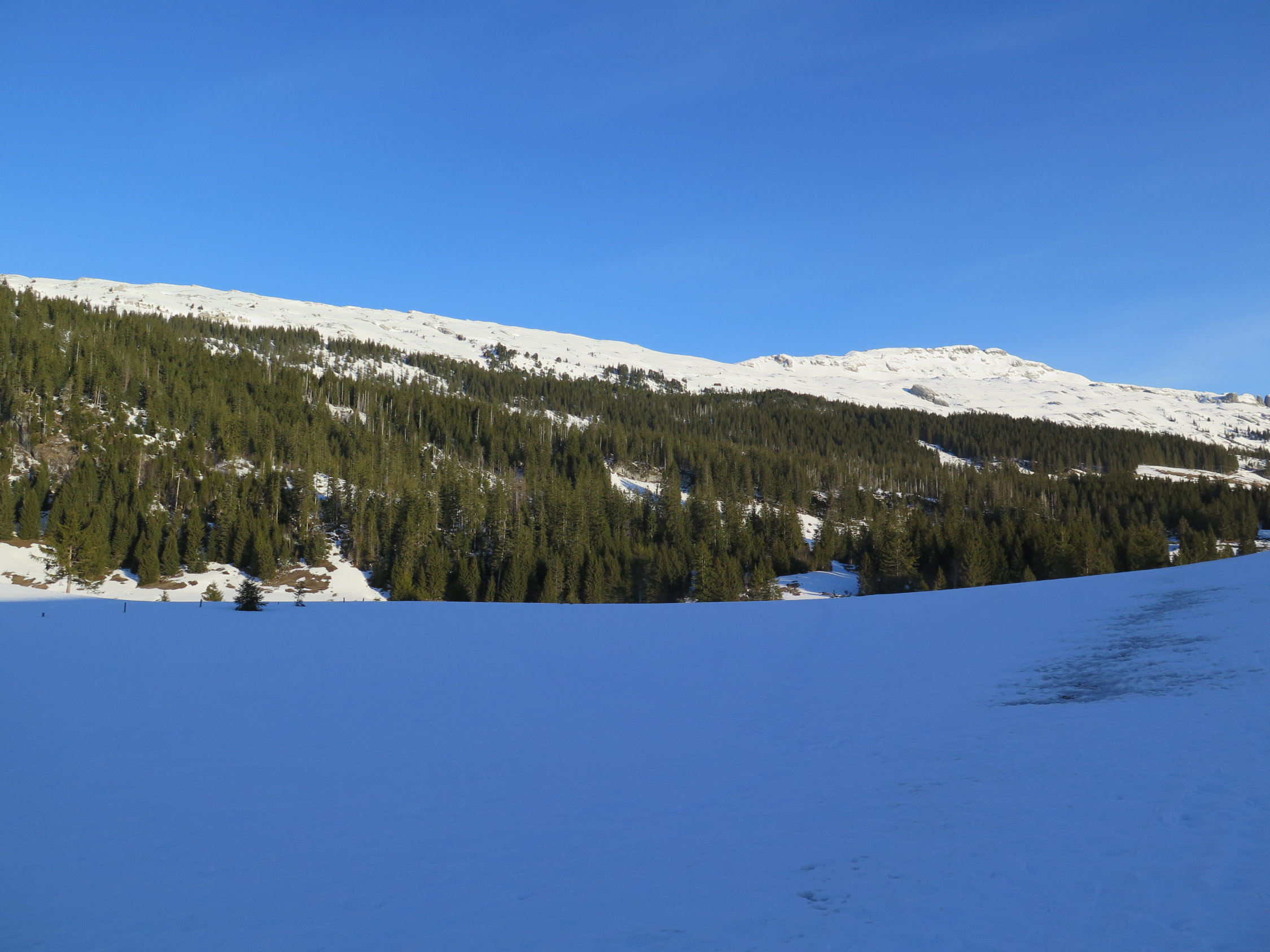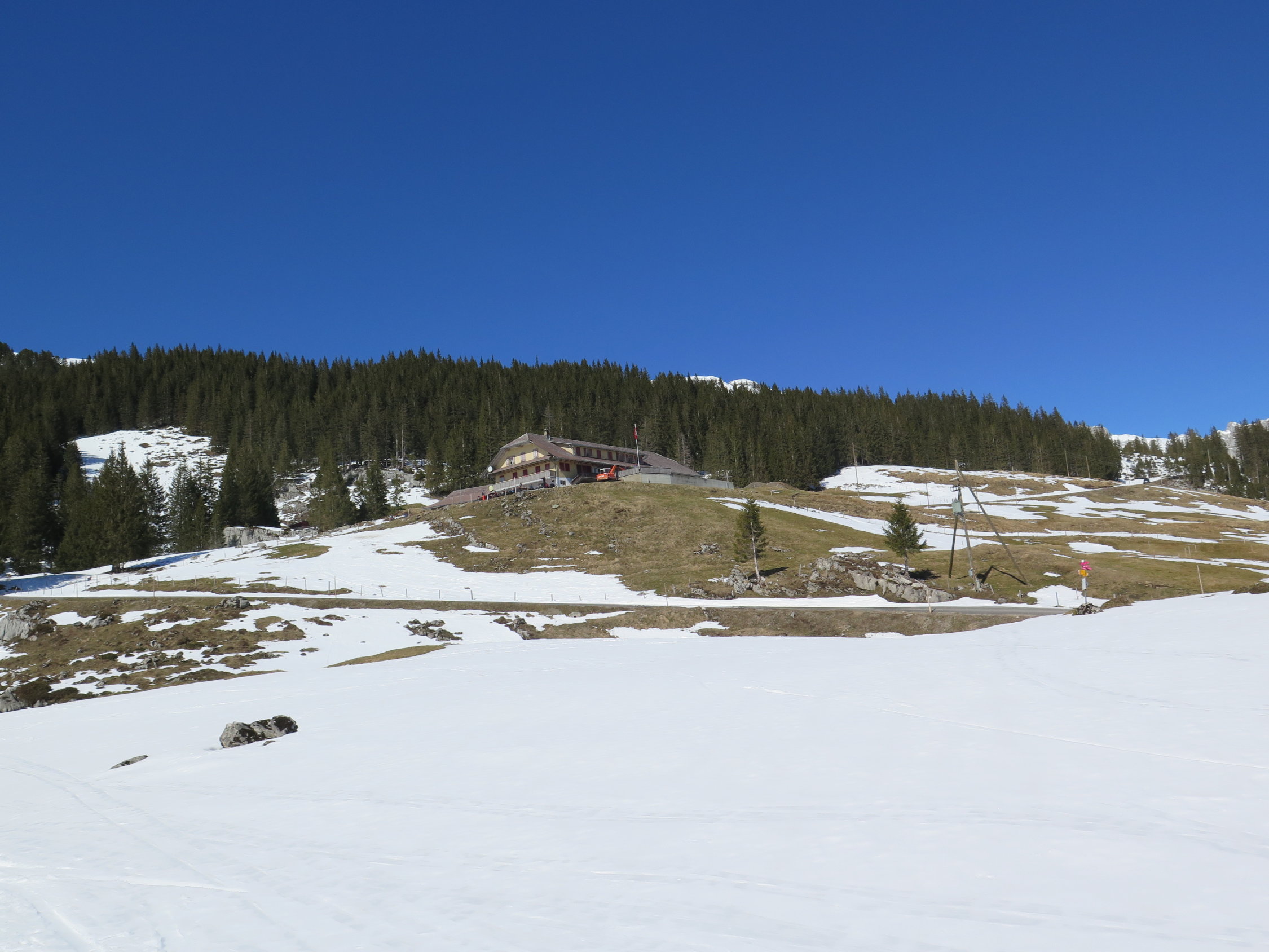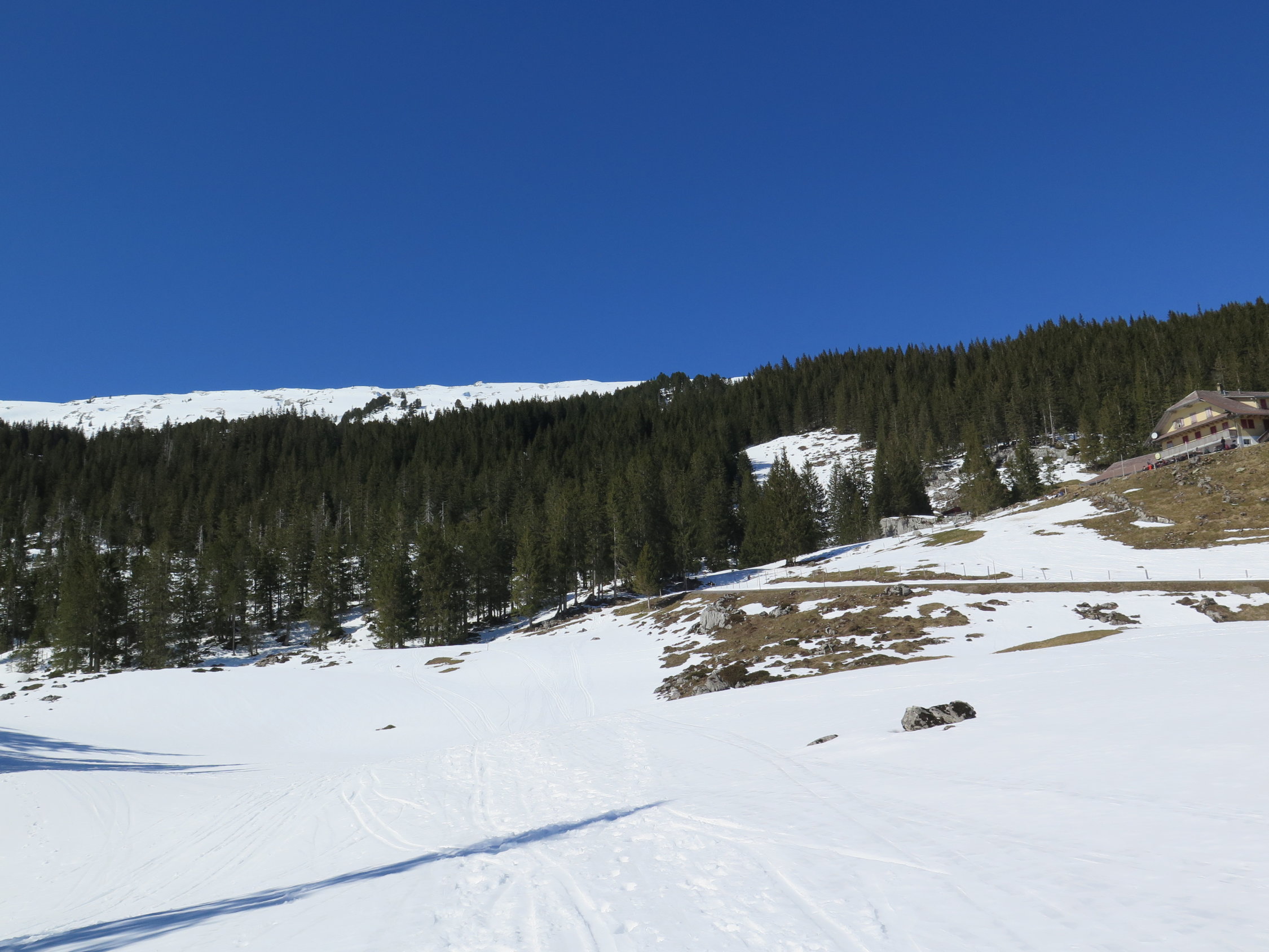 Einmal mussten wir die Strasse überqueren, und deshalb 1x Ski abschnallen. Im Moment noch durchgehend ab PP bei Wagliseichnubel Schnee.