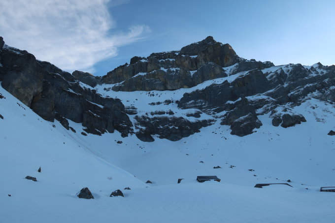Für die Steilstufe oberhalb des Mettener Butzli waren am Morgen bei gefrorener Schneeoberfläche Steigeisen nötig. In der Abfahrt kurz nach Mittag konnte die Stelle mit Ski abgefahren werden.