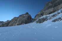 Ansonsten im Couloir meist guter, teils eher tiefer Trittschnee. Nirgends pickelhart. Bei den aktuellen Verhältnissen daher Steigeisen und 1 Pickel ausreichend. Der Aufstieg findet komplett im Schnee statt.