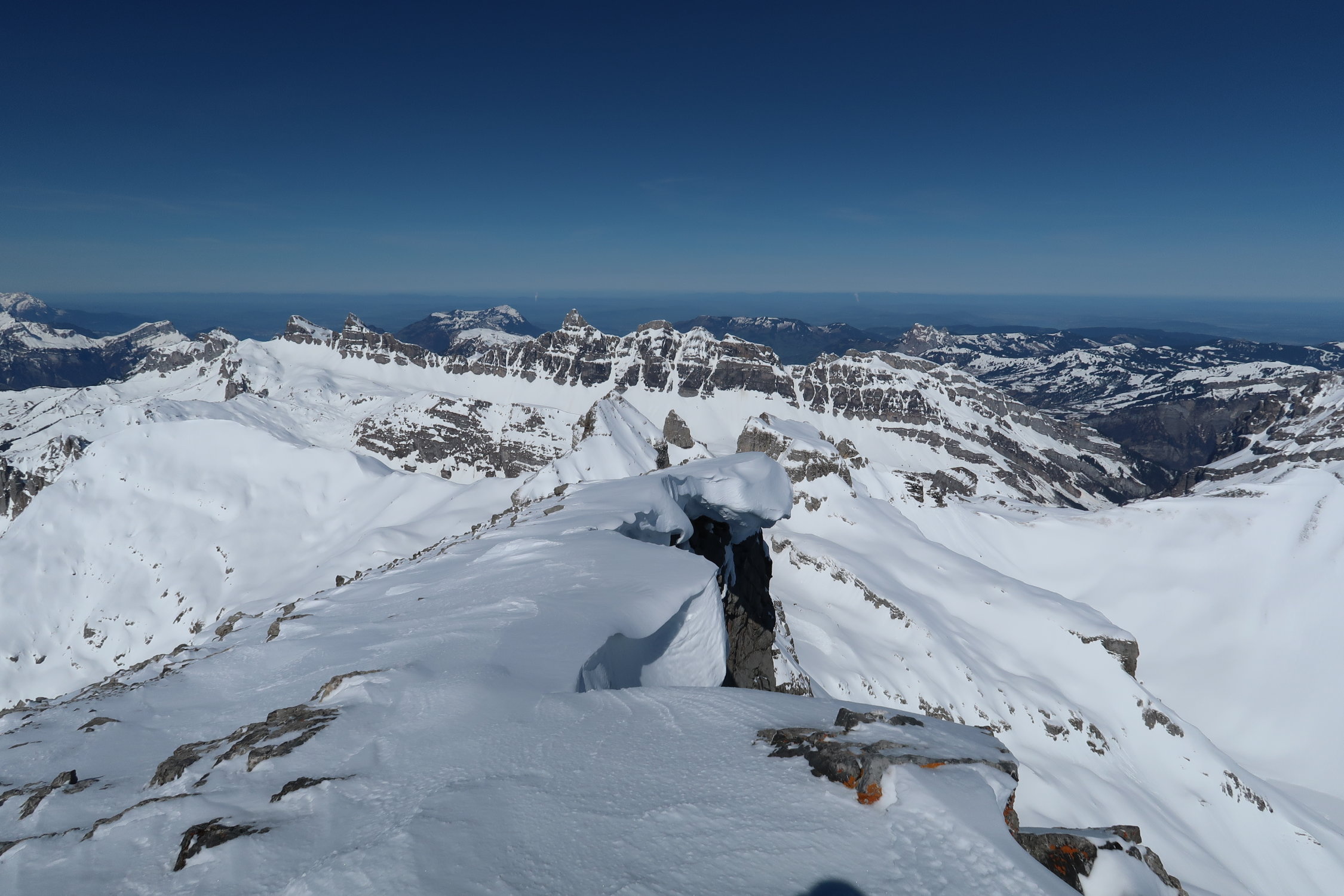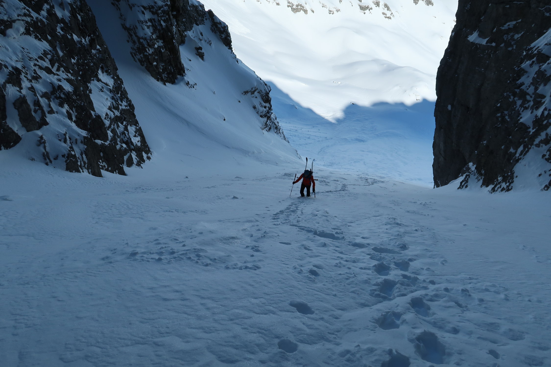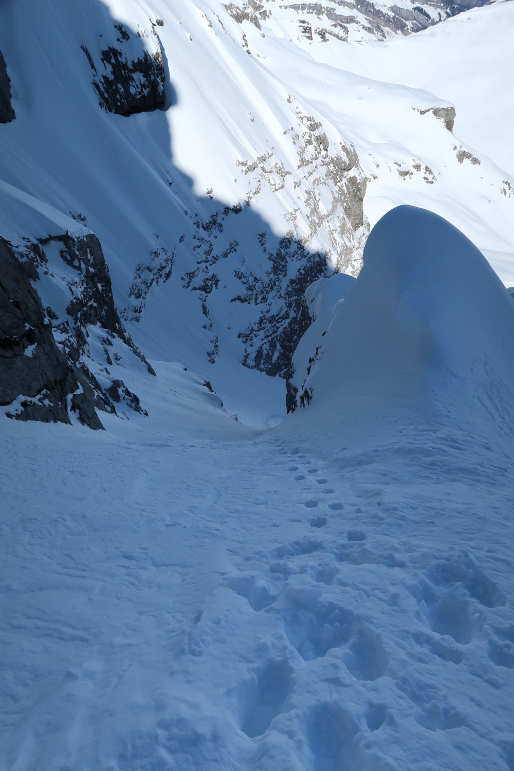 Über das Alpler Tor problemlos in kurzer Abfahrt zum Couloirfuss. Im Couloir teilweise etwas Triebschnee auf teils tragender Kruste. Etwas ruppig, aber gut fahrbar. Wir haben die Skis bis zum Verzweiger des Couloirs mitgenommen, zwei andere, welche über den Sommernormalweg aufgestiegen sind aber vermutlich von oben gefahren. Daher wird man unsere Aufstiegsspur vermutlich nur noch teilweise sehen.