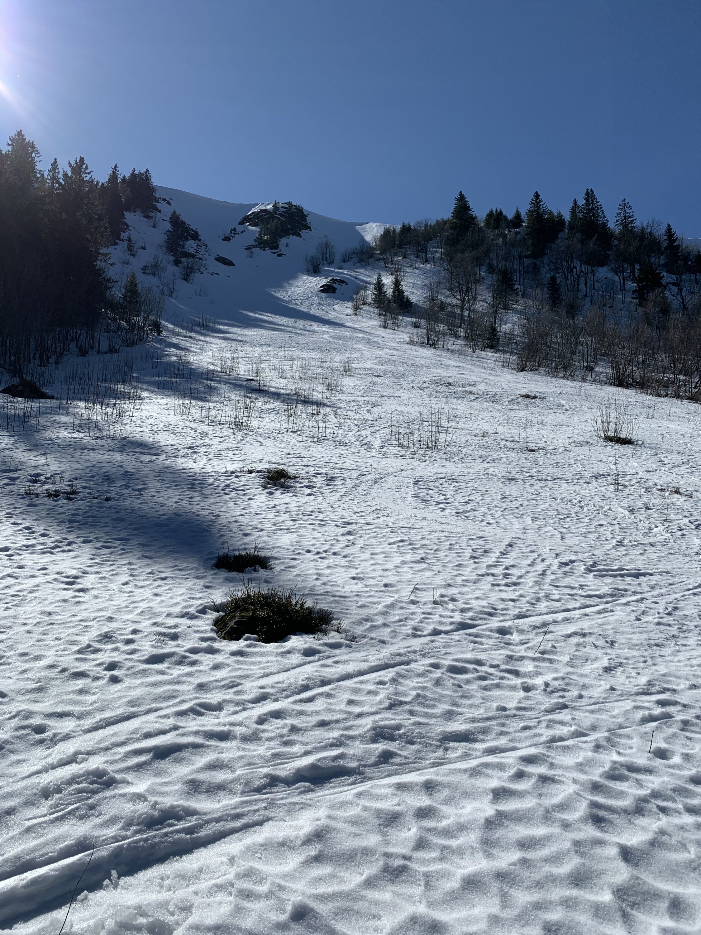 Zastler Loch: viele Varianten möglich, doch bretthart, auch um 14 h kein bisschen aufgefirnt - Ausstieg am Wasserreservoir ohne Harscheisen eklig