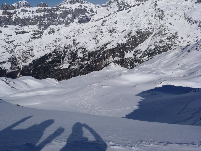 Aktuell findet sich fast alles auf der Route. Erste 600hm ruppiger Aufstieg. Bis zur Steilstufe wenig Pulver auf harter Unterlage. Bei der Steilstufe sehr viel Pulver und viel Wühlarbeit. Bis zum Gipfel Sulz.