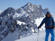 Der wenige Schneefall vom gestrigen NM und vielleicht auch über Nacht erleichterte uns den Aufstieg über den Bösen Tritt sehr. Es ging komplett ohne Harscheisen. Bei wundervollem strahlendem Wetter ging es in Richtung Gipfel, vom Wind wurden wir begleitet und noch 3-4 weiteren Tourengehern.