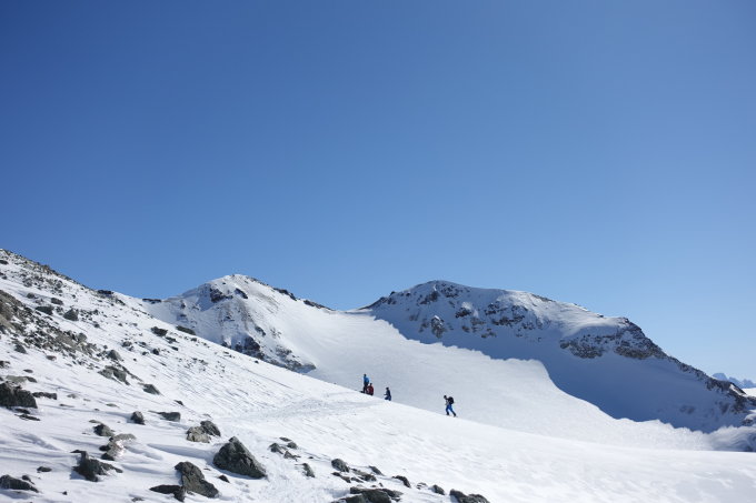 Abweichend von der Routenbeschreibung vom Hospiz aus über den Agnelpass an der Jennatschütte vorbei hoch auf den Piz Calderas und den gleichen Weg zurück. Mit Abstecher auf den Piz Campagnung kamen so auch 2200Hm zusammen. Relativ wenig Leute unterwegs, auch infolge der Schließung der Jennatschhütte. Gute Verhältnisse, teils leichte Pulverauflage, Presspulver oder harter Firn. Gute Schneeauflage, nur die letzen 50 Hm zum Calderas musste man wegen herausschauender Steine zu Fuß gehen.