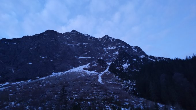 Schnee noch firnig und gut zu stapfen, Fels trocken und gut zu klettern. Allgemein sehr wenig "weiß" in der Wand.