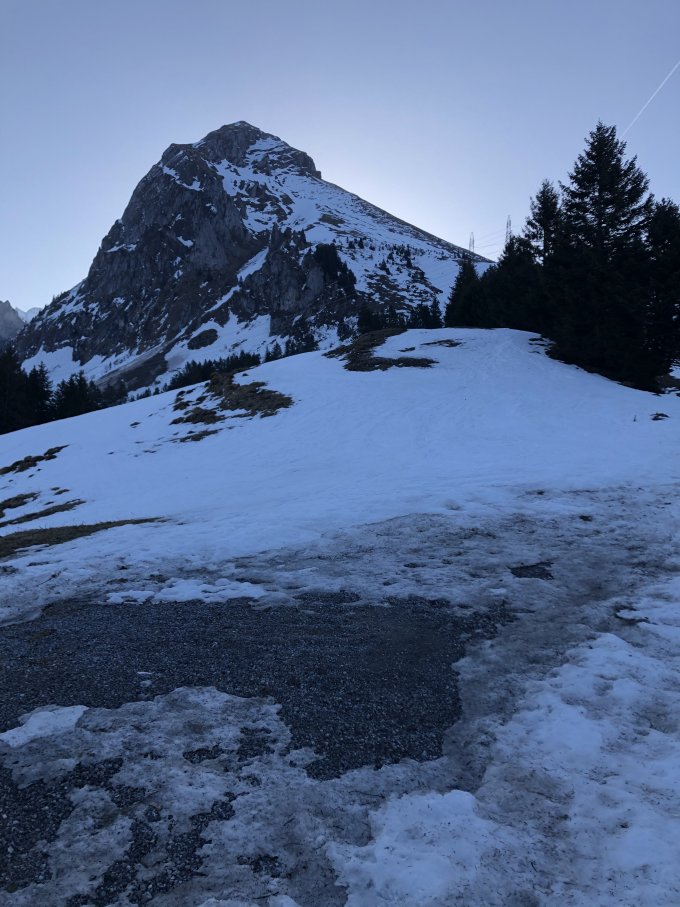 Abfahrt um 11:30 auf der Normalroute. War immer noch etwas früh. Verhältnisse pistenähnlich. Kurzer Gegenanstieg zur Endstation Skilift, von da durchgehende Schneedecke bis zum Parkplatz.