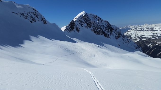 Am Berg waren ca 5 Aufstiegsspuren vom Wochenende - zwei davon von der Trift her kommend, drei fuhren über den Gigligletscher ab (da alleine = für mich zu steil, ich fuhr auf der westlichen Route ab)