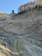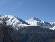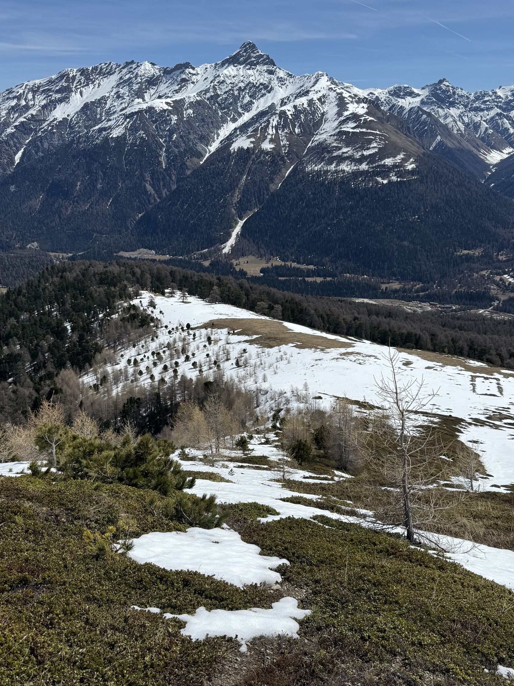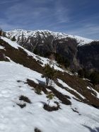 Erkundungstour auf den Munt in der Nordostflanke Munt Griatschouls 2768 m, ÖV Tour T4. Start Zuoz Bahnhof RhB 8.15 Uhr, 5 Grad, blauer Himmel, windstill. Auf Alpsträsschen bis oberhalb Acla Laret und über Wiese zum Wanderweg zur Alp, teilweise Schnee. Ab Alp Griatschouls weglos auf Ostrücken Munt Griatschouls und ab Höhe 2250 m in der steilen Flanke bis Höhe 2315 m. Hier Umkehr etwa 400 m vor Gipfel, da viel Schnee in der Flanke und daher Weglein nicht mehr zu sehen. Retour und Abstieg via Alp Griatschouls nach S-chanf.