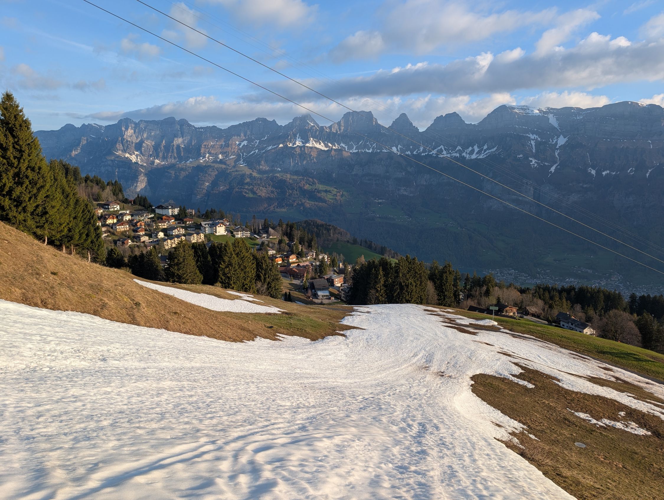 Aufgrund fehlenden Schnees über Maschgenkamm hoch und dann Richtung Tan enboden ab. Sehr schön zu fahren der Pistenschnee und beinahe komplett unterbrechungsfrei (ein Strasse quert häufiger) anzuführen.