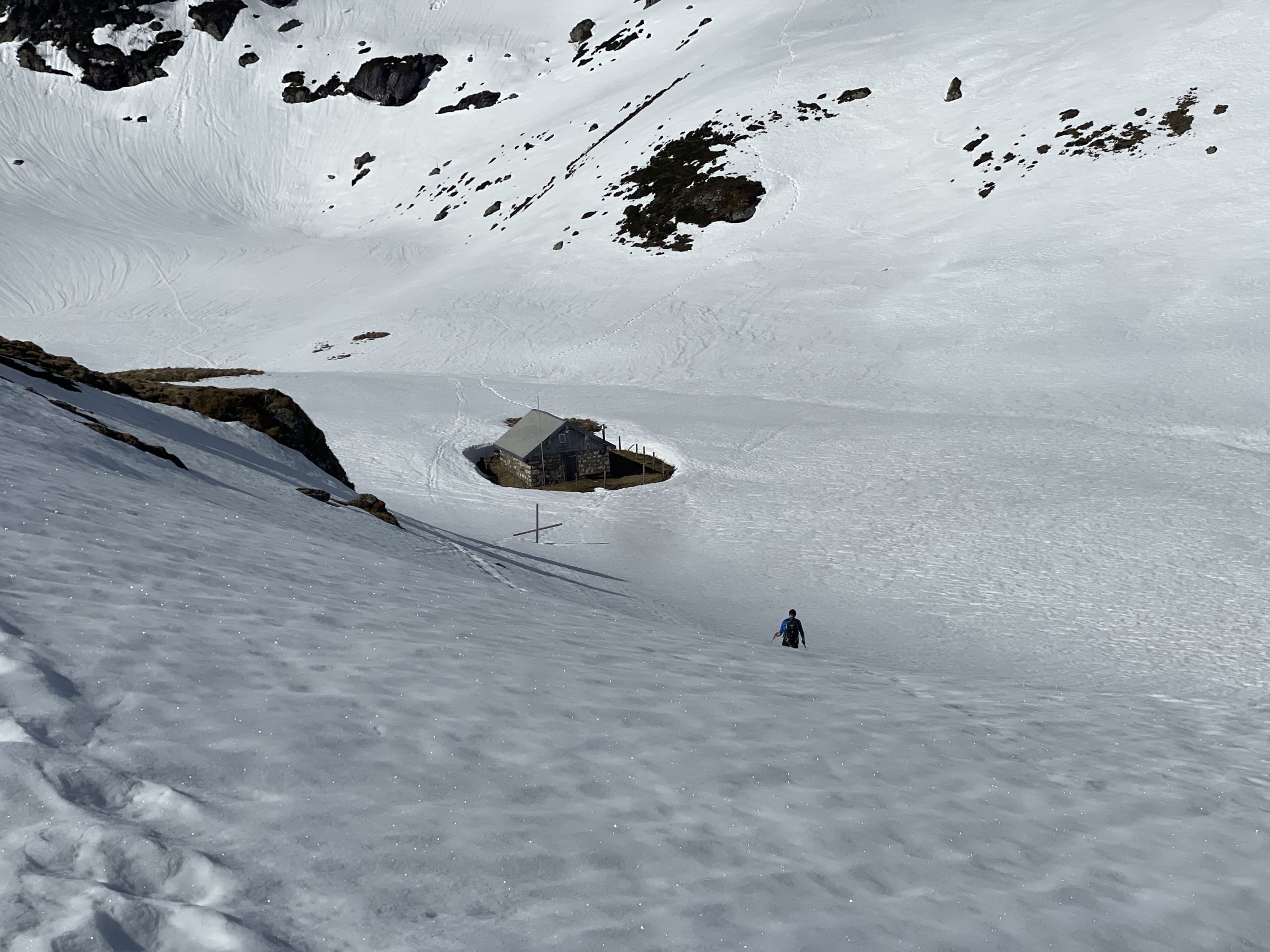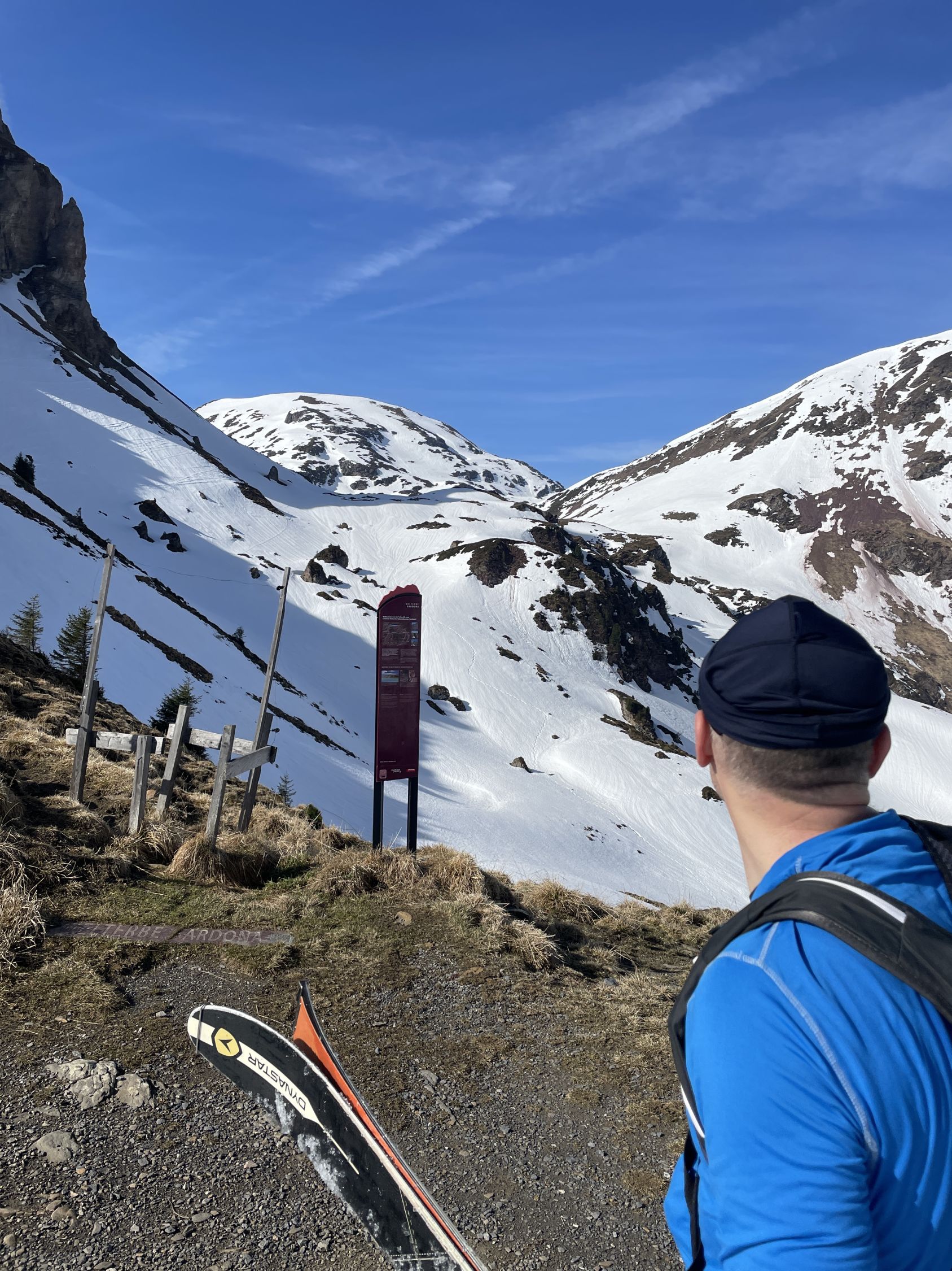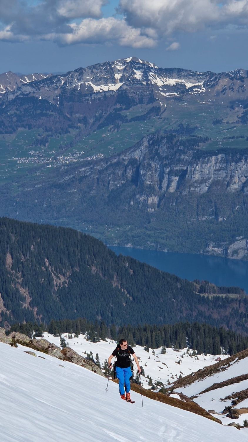 Ab pplatz tannenbodenalp kann man noch gut via piste hoch. Vom Stellisattel dann gequert, leist talstation vorbei zum chrüezen.. hier kurze tragepassage und dann auf fellen runter/queren zum chrümmelbäch. Aufstieg gipfelhang gut machbar. Alles tragend und gut zu gehn..Zum leist rüber dann am kamm circa 10 min getragen. Fuhren dann leistpiste ab zum seebli. Das war top. Zum Maschgenkamm gingen auch viele hoch. Das sollte noch eine weile gehen…