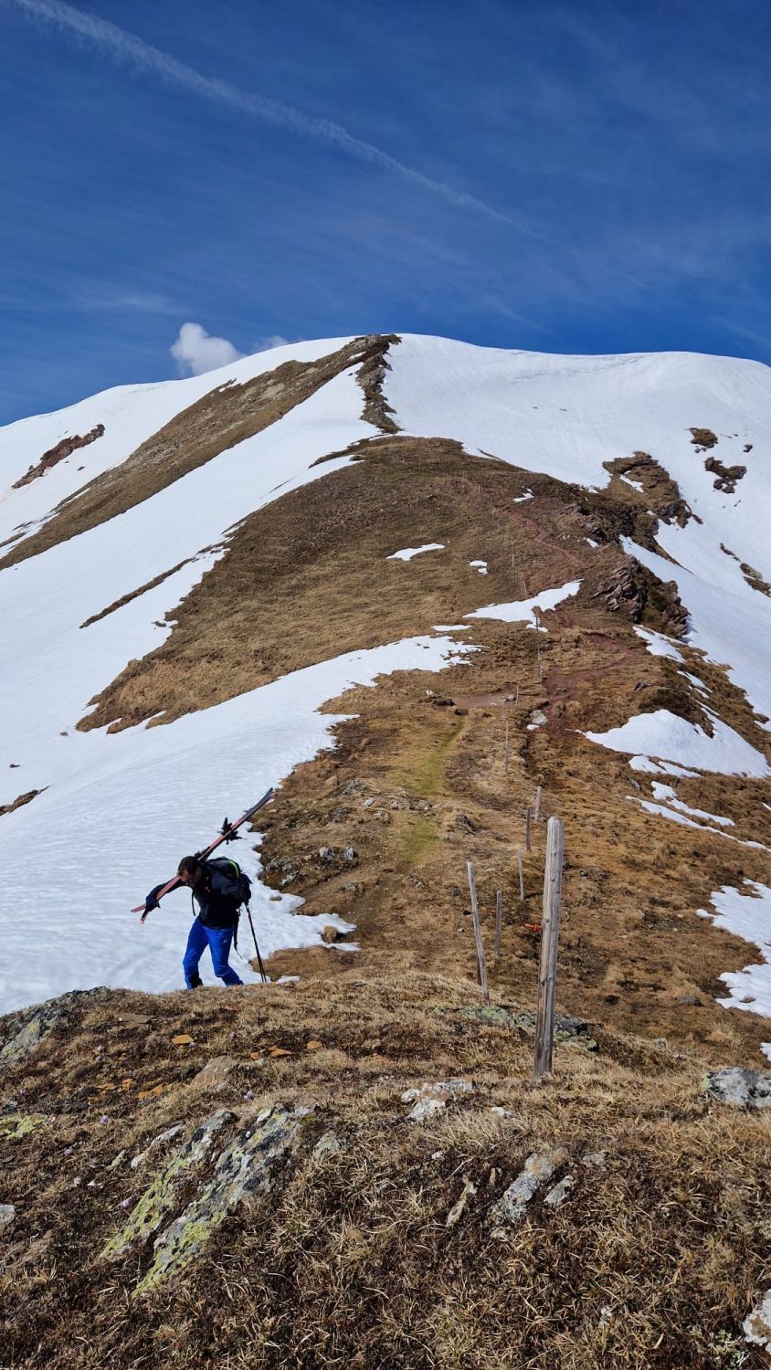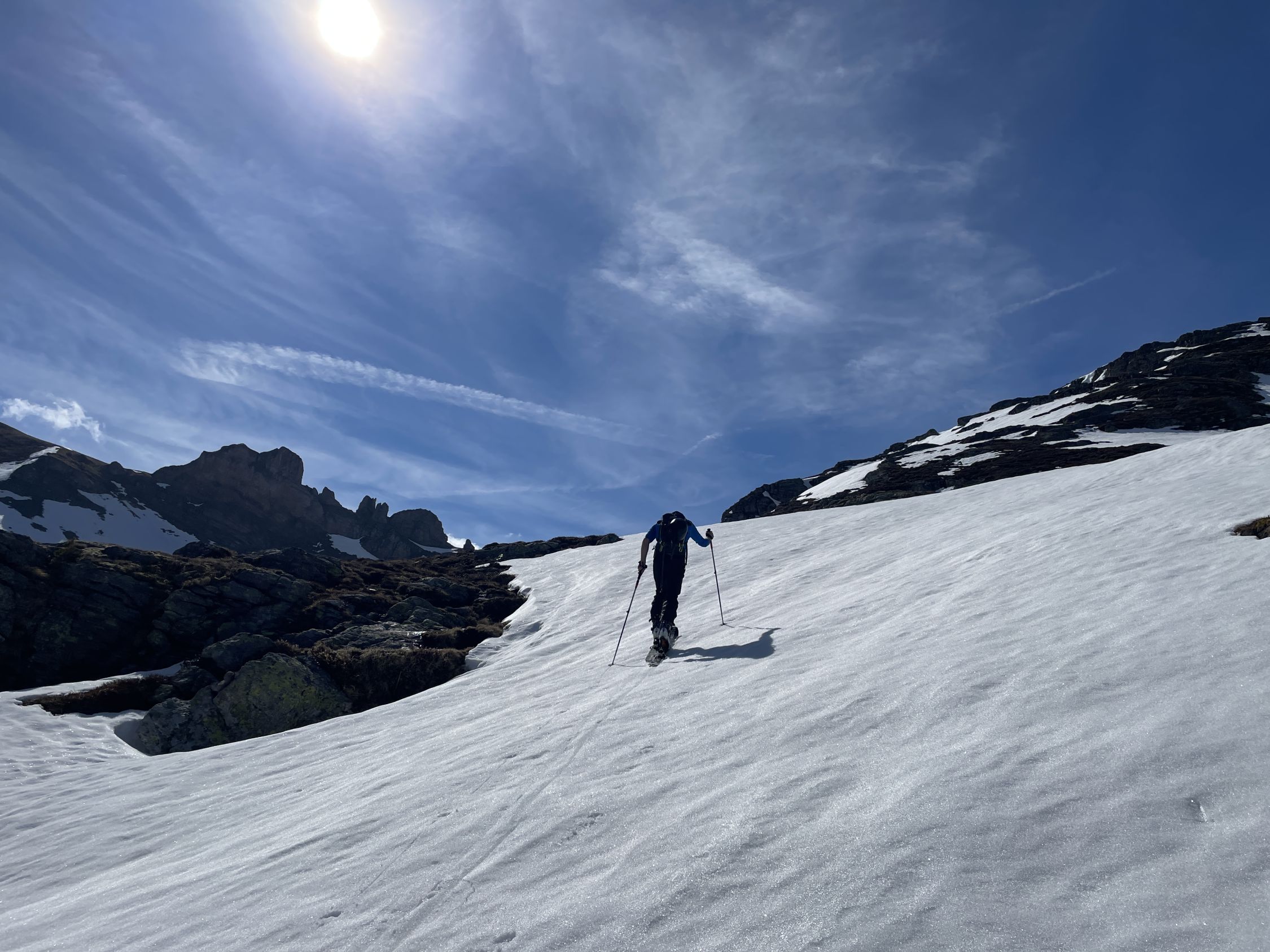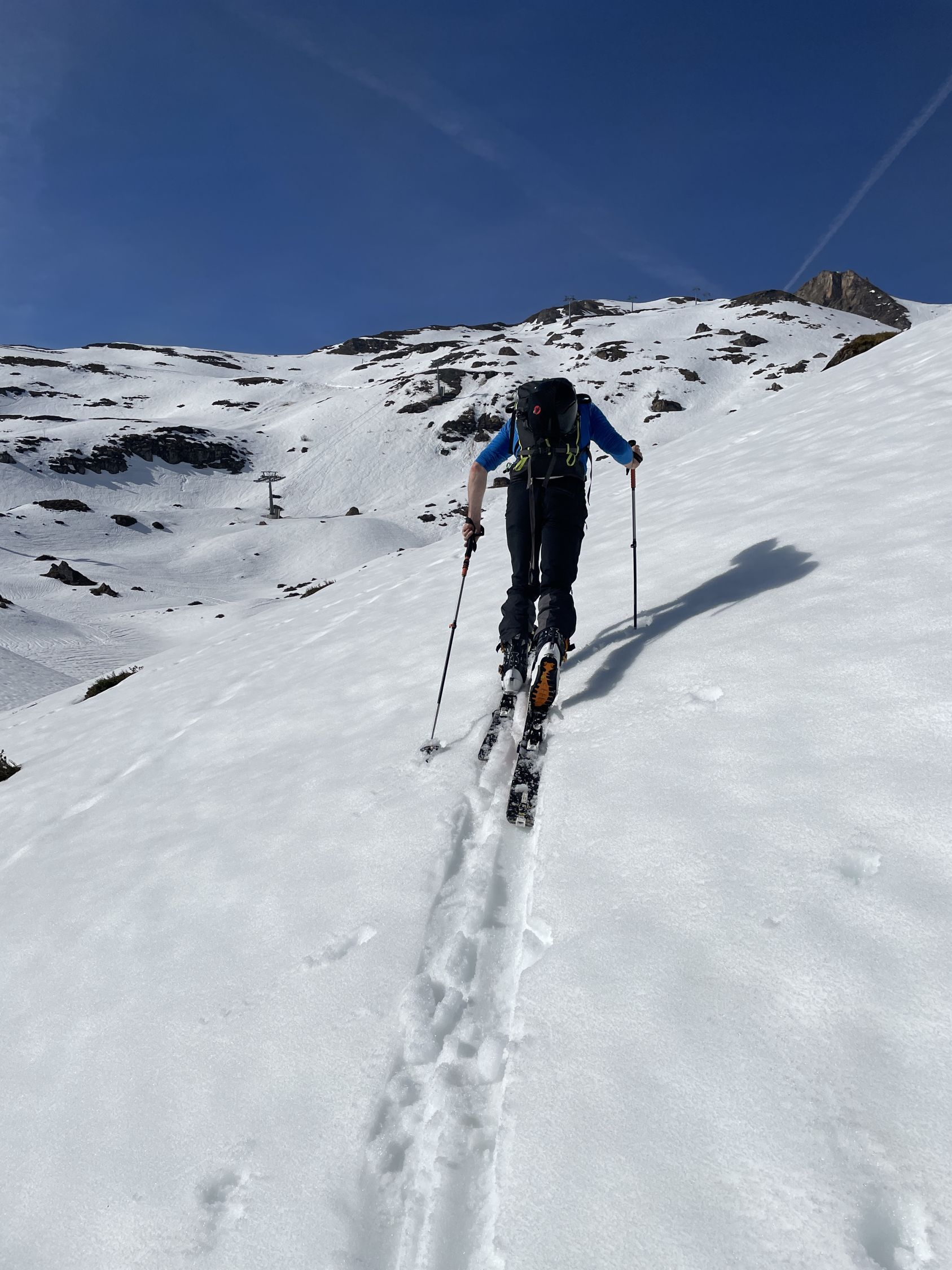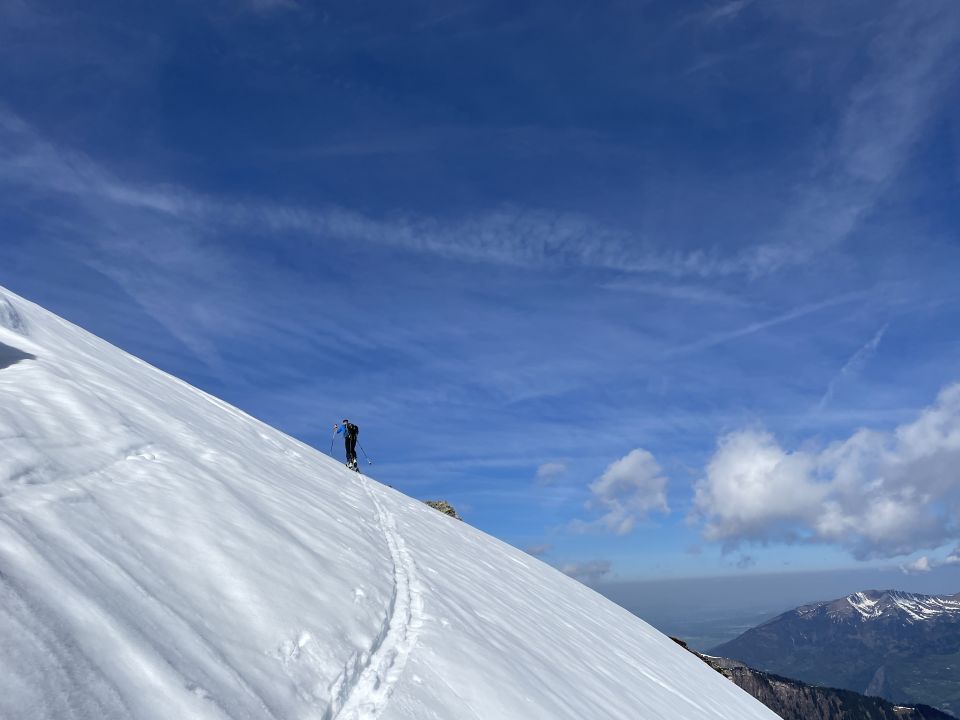 Ab pplatz tannenbodenalp kann man noch gut via piste hoch. Vom Stellisattel dann gequert, leist talstation vorbei zum chrüezen.. hier kurze tragepassage und dann auf fellen runter/queren zum chrümmelbäch. Aufstieg gipfelhang gut machbar. Alles tragend und gut zu gehn..Zum leist rüber dann am kamm circa 10 min getragen. Fuhren dann leistpiste ab zum seebli. Das war top. Zum Maschgenkamm gingen auch viele hoch. Das sollte noch eine weile gehen…