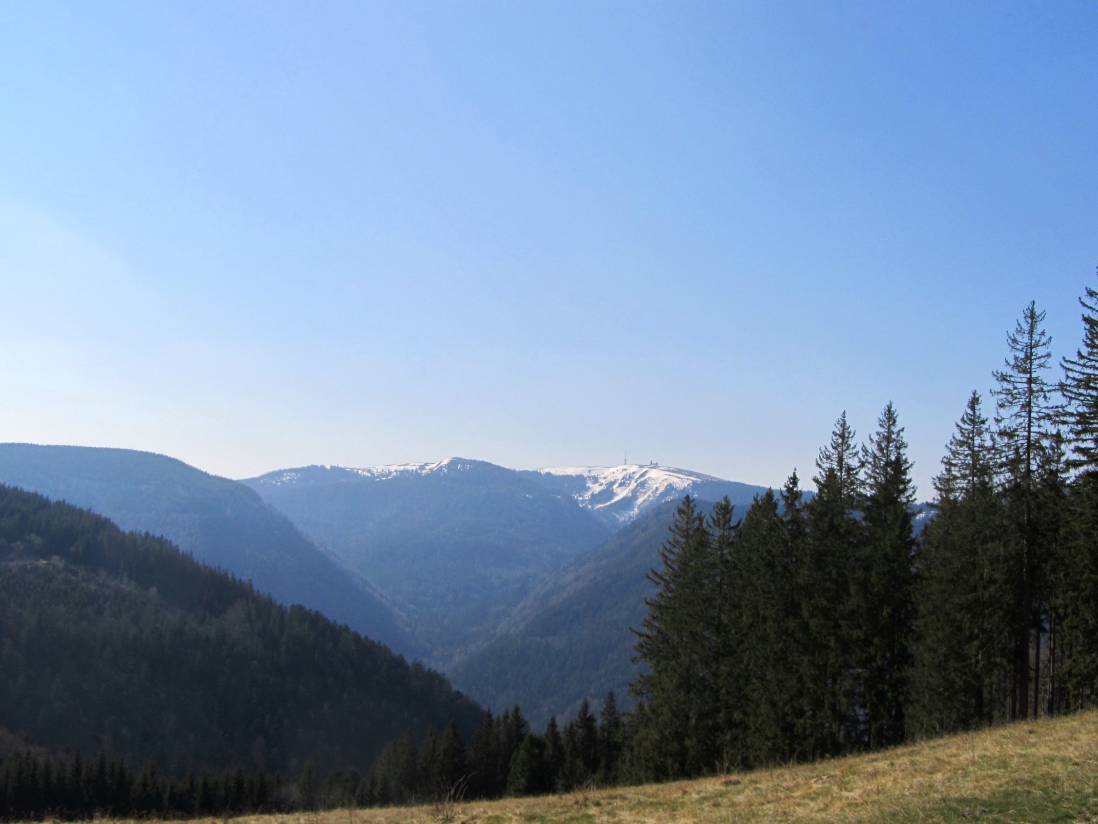 Unten eine Frühlingspracht. Der Schnee hat sich in die Nordhänge vom Feldberg zurückgezogen.