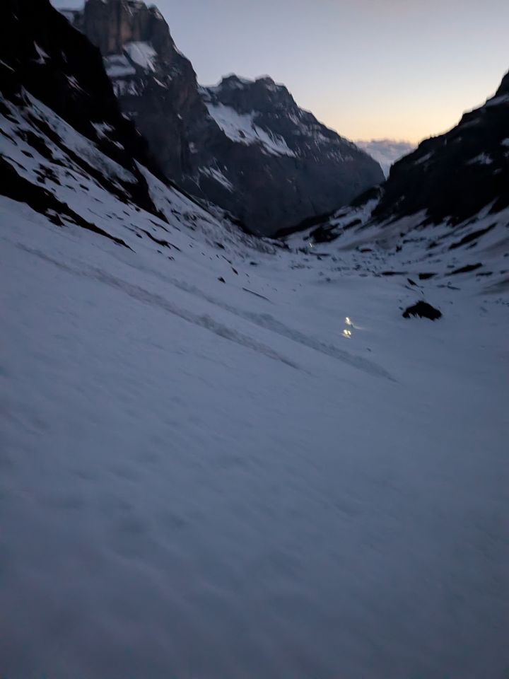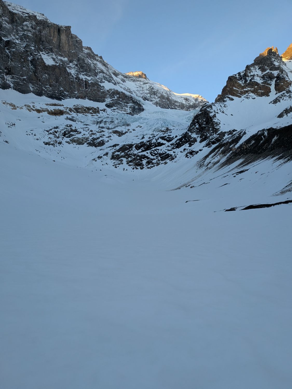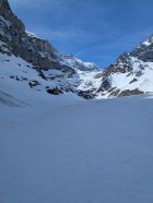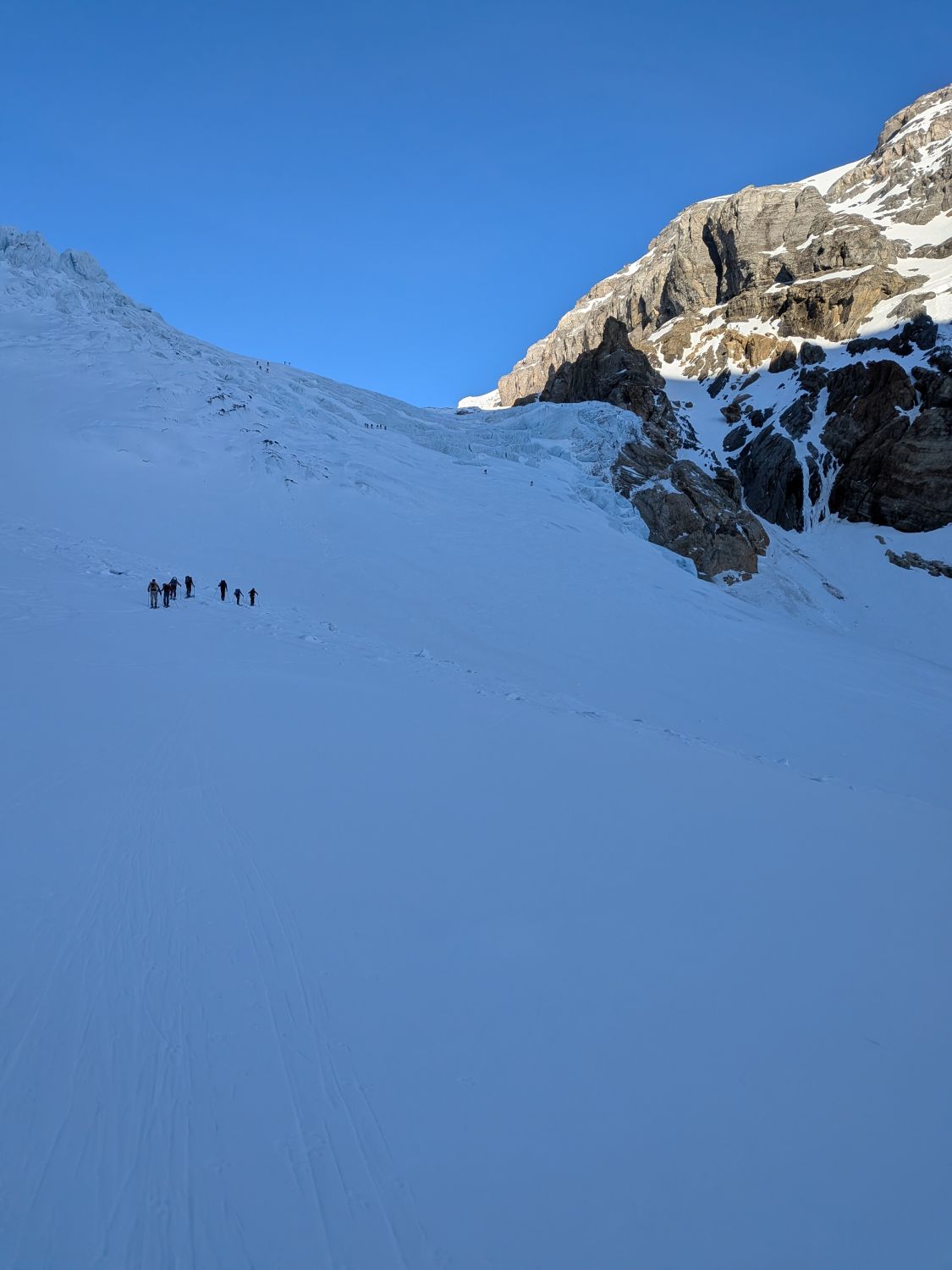Der erste Abbruch wird ganz links überquert, der zweite durch die Mitte. Steigeisen sind nicht nötig, Harscheisen empfehlenswert. Der Gletscher ist aber sehr gut eingeschneit und Anseilen ist eher optional. Für die Abfahrt um ca. 11:00 wunderbarer Sulz auf der linken Gletscherseite.