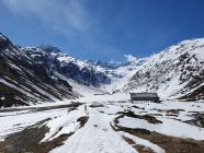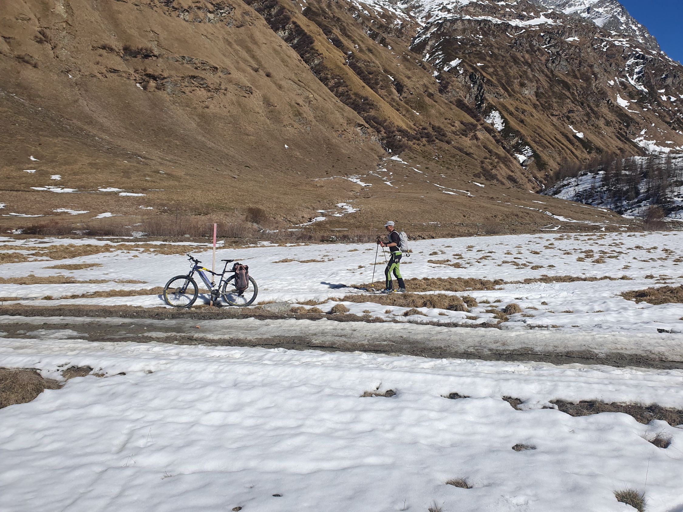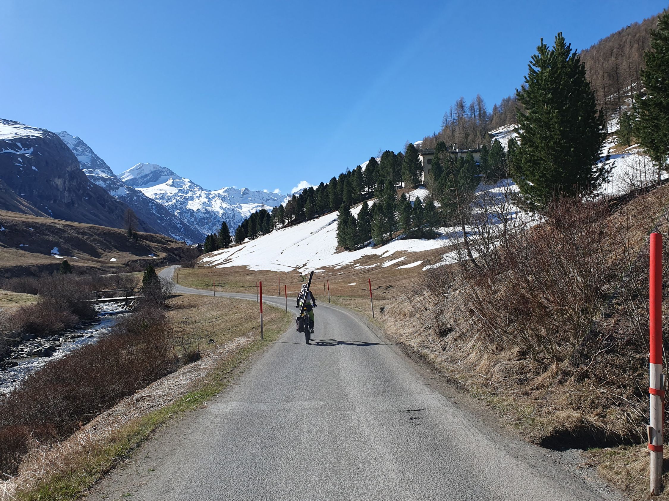 Trotz Zugverspätung hat der Bus nach Chiavenna doch noch gewartet. Somit kam ich doch noch um 09:45 in Sils Maria Post an, wo Hermon sicher schon ganz zappelige Beine auf seinem E-Bike bekommen hatte. Mit dem E-Bike Turbo-Modus fuhren wir dann so schnell wie möglich in das Val Fex rein. Ich war hier doch froh, dass Hermon mich für die E-Bike-Mitnahme überzeugt hatte. Denn nur so konnten wir die 6 km apere Strasse effizient vorankommen. Bis Chalchais ging die Fahr sehr gut und danach mit zwei elektrischen Zäunen und Match auf der Strasse mühsam noch etwas weiter bis P1979, wo wir bei der Brücke dann endgültig unsere E-Bikes zurücklassen mussten. Später in der Saison könnte man damit sicher noch bis P2308 schaffen.