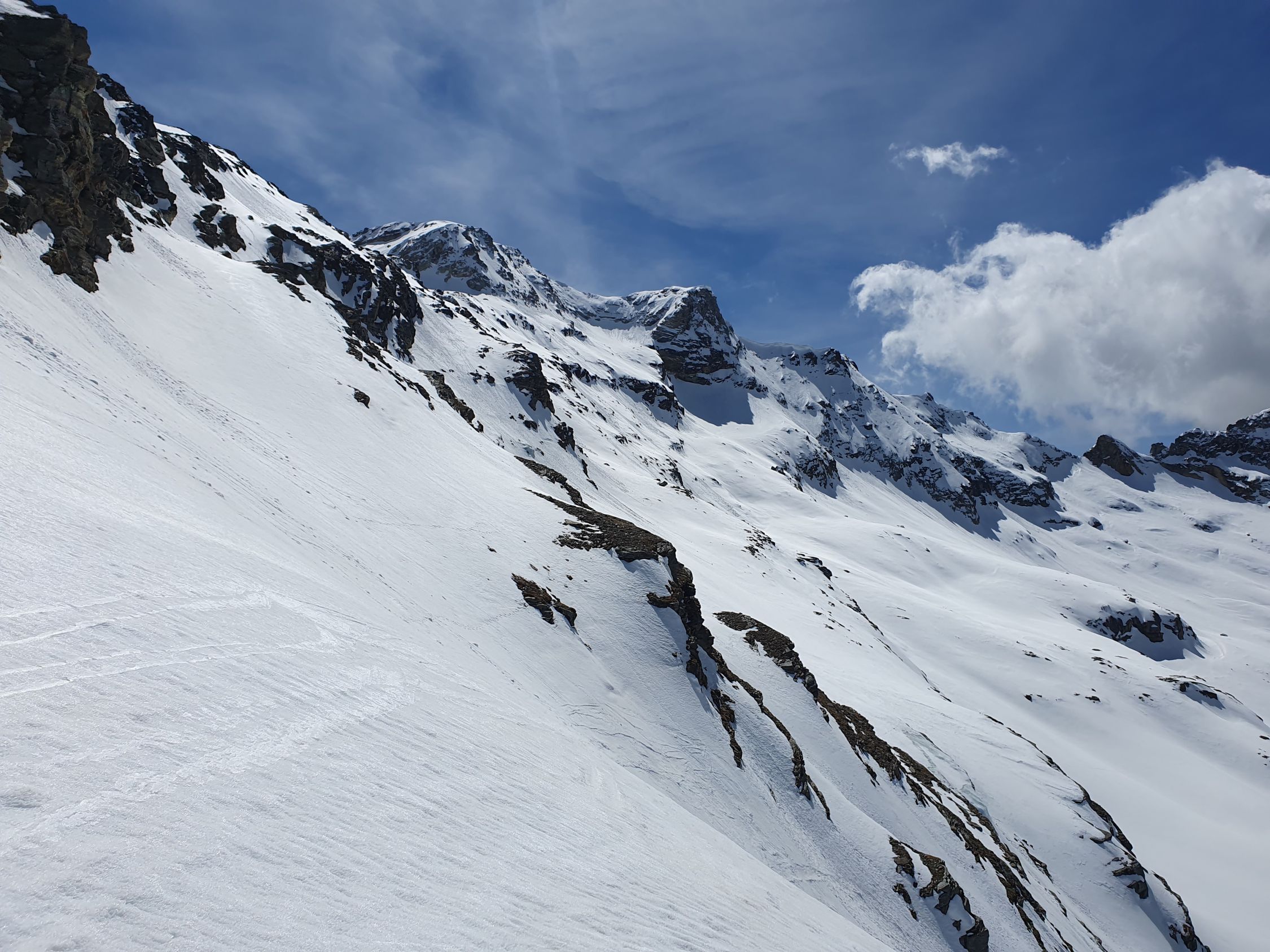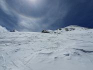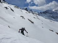 Mal steiler, mal flacher traversierten wir via P2725 die Hänge auf Hart- und Sulzschnee, je nach Hangneigung, in Richtung Vadret dal Tremoggia immer den drei vorhandenen Spuren nach. Nur eine kleine steile Passage benötigte aufgrund des Hartschnees etwas Aufmerksamkeit. Der Übergang zum Vadret war unauffällig und dieser Gletscher weist aktuell keine Spalten auf. Wir waren so verzaubert vom hellen Gestein des Piz Tremoggia, dass wir in Nullkommanix bei der Fuorcla Fex-Scerscen ankamen. Ab hier stiegen wir steil über Zastrugis hoch und via Forcola Malenco zum Skidepot unter dem Felsrigel bei ca. 2345Hm. Nun eine kurze Kletterstelle über einen Felsband (II) und auf guten Fussspuren weiter auf teil einsinkendem Griesschnee über ein schräges Plateau hoch zum Piz Malenco mit Steinmann. Man achte hier beim Fussaufstieg auf die schrägen Platten, die unter dem Schnee schlummern und rutschig sind.