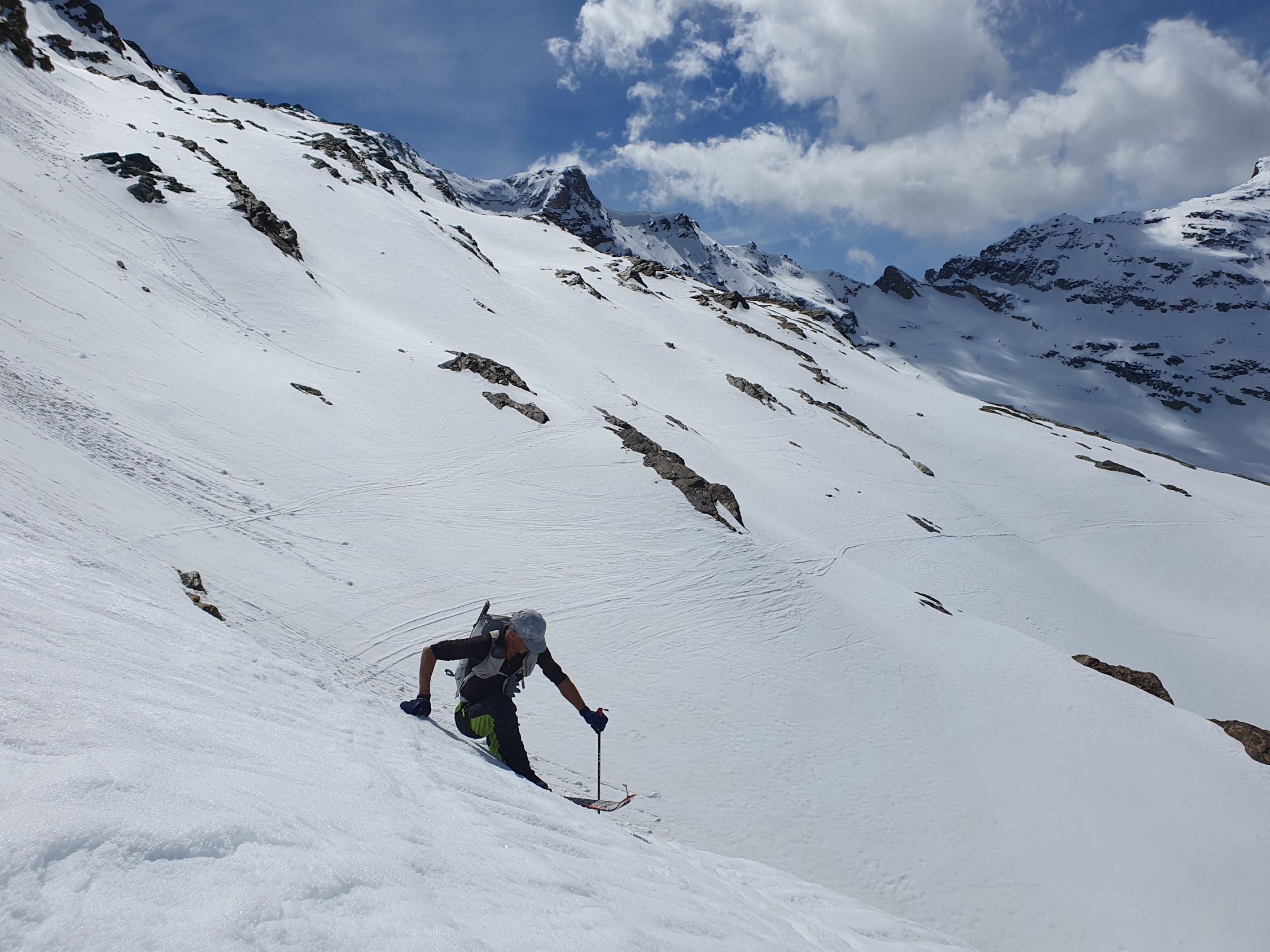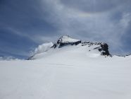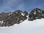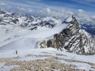 Zu Fuss wieder zurück zum Skidepot, wo ich beim Felsrigel ohne Steigeisen etwas mehr Zeit beanspruchte als Hermon, und anschliessend mit den Fellen an den Ski direkt hinab zur Forcola Malenco. Ab hier direkt mit etwas Slalom zwischen den wunderschönen glänzenden weissen Steinen hoch zum Vorgipfel und einfach hinüber zum Hauptgipfel des Piz Tremoggia, der nur 3Hm höher liegt als der Piz Malenco.