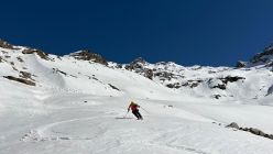 Die Abfahrt war viel besser als beim Aufstieg erwartet! Es hatte heute einen grossen Vorteil, dass wir so spät gestartet sind und deswegen erst um 15:20 vom Piz Tremoggia abgefahren sind. Dank den mittlerweile aufgeweichten Zastrugis war die obere Abfahrt bis zur Fuorcla Fex-Scerscen ohne Skigezittere erstaunlich gut zu fahren. Danach schwangen wir auf leichtem Sulzschnee weiter hinab über wunderschöne Hänge bis in das Val Fex. Unten konnten wir auf der W-Seite, wo der Schnee im Schatten wieder leicht einfror, noch etwas weiterfahren, doch wir kamen nicht drum herum gegen Schluss bis zum E-Bikedepot doch noch unsere Ski mit den Stöcken in einsinkendem Schnee zu schieben, wo wir um 16:30 ankamen.