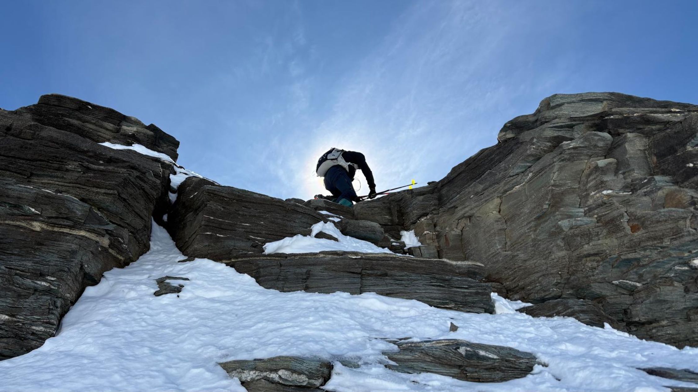Oben haben wir uns bei Windstille eine etwas längere Pause gegönnt. Da bei einem meiner Skischuhe das Boa-Schnürsystem plötzlich kaputt war, musste ich es kurzerhand mit einem Seil um den Schuh herum fixieren, was erstaunlicherweise gut ging. Die moderne Technik hat nicht nur Vorteile…