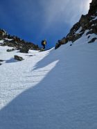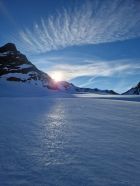 Am Freitag versuchten wir über eine alternative Route als an der Südflanke des Piz Tuoi vorbei zur Hinteren Jamspitze zu gelangen, gemäß einer in der Skitourenkarte eingezeichneten direkteren Variante. Letztlich vergeblich, wobei wir wirklich kreativ waren. Auf zwei Scharten standen wir, die wir jeweils über bockhart gefrorene Steilhänge sowie Kraxeleien in heiklem Gelände erreichten. Der dritte Versuch über die in der Karte angeführte Route zum Jamjoch, die uns aufgrund des sperrigen Felsriegels im oberen Bereich zuerst zu heikel erschien, brachen wir dann aufgrund des inzwischen weichen Schnees in der steilen Flanke ab. Beseelt vom Abenteuer in der beeindruckenden Szenerie genossen wir dann die zahlreichen Hänge im perfekten Firn und anschließend wieder die Gastfreundschaft auf der Tuoi-Hütte.