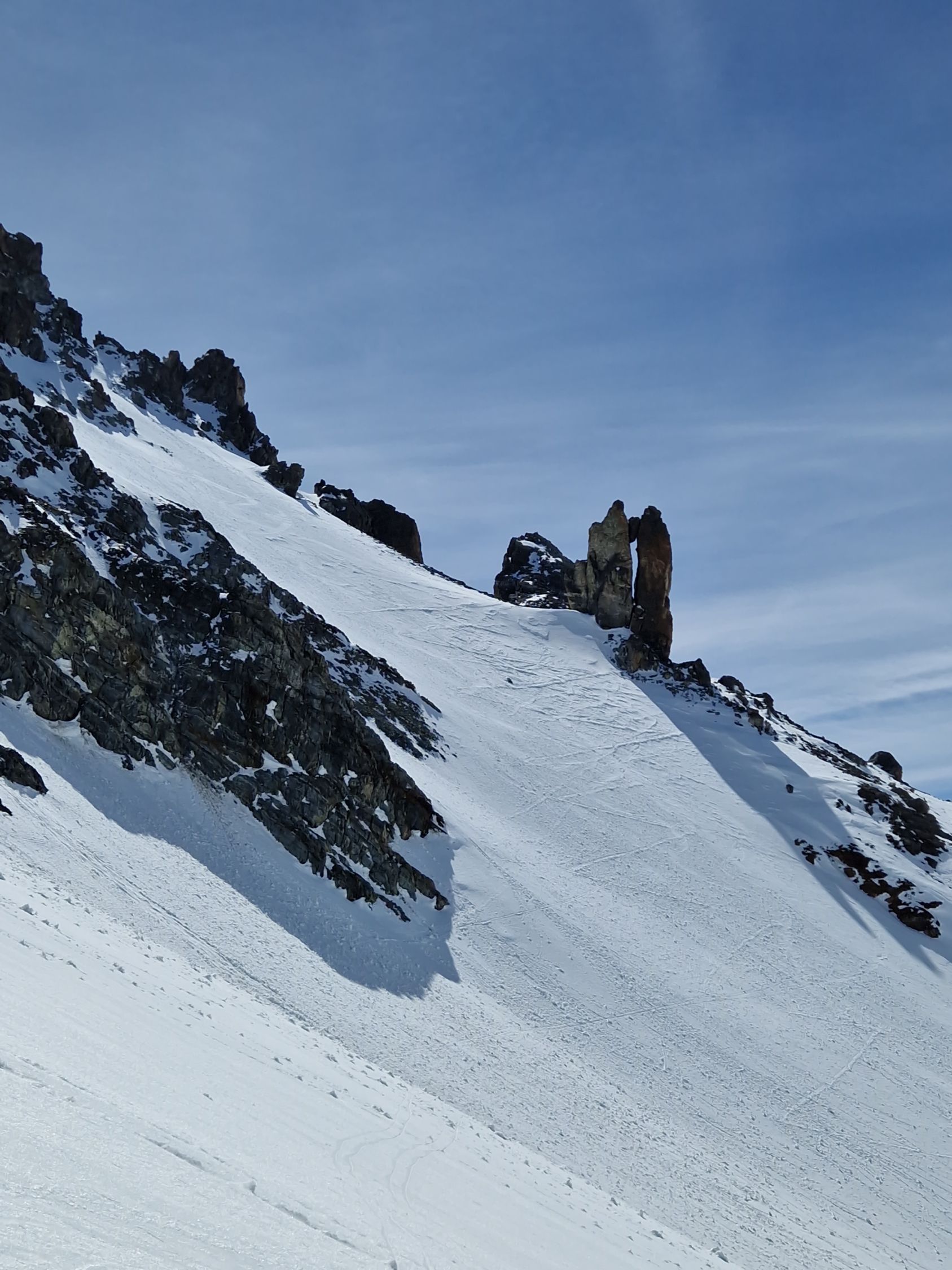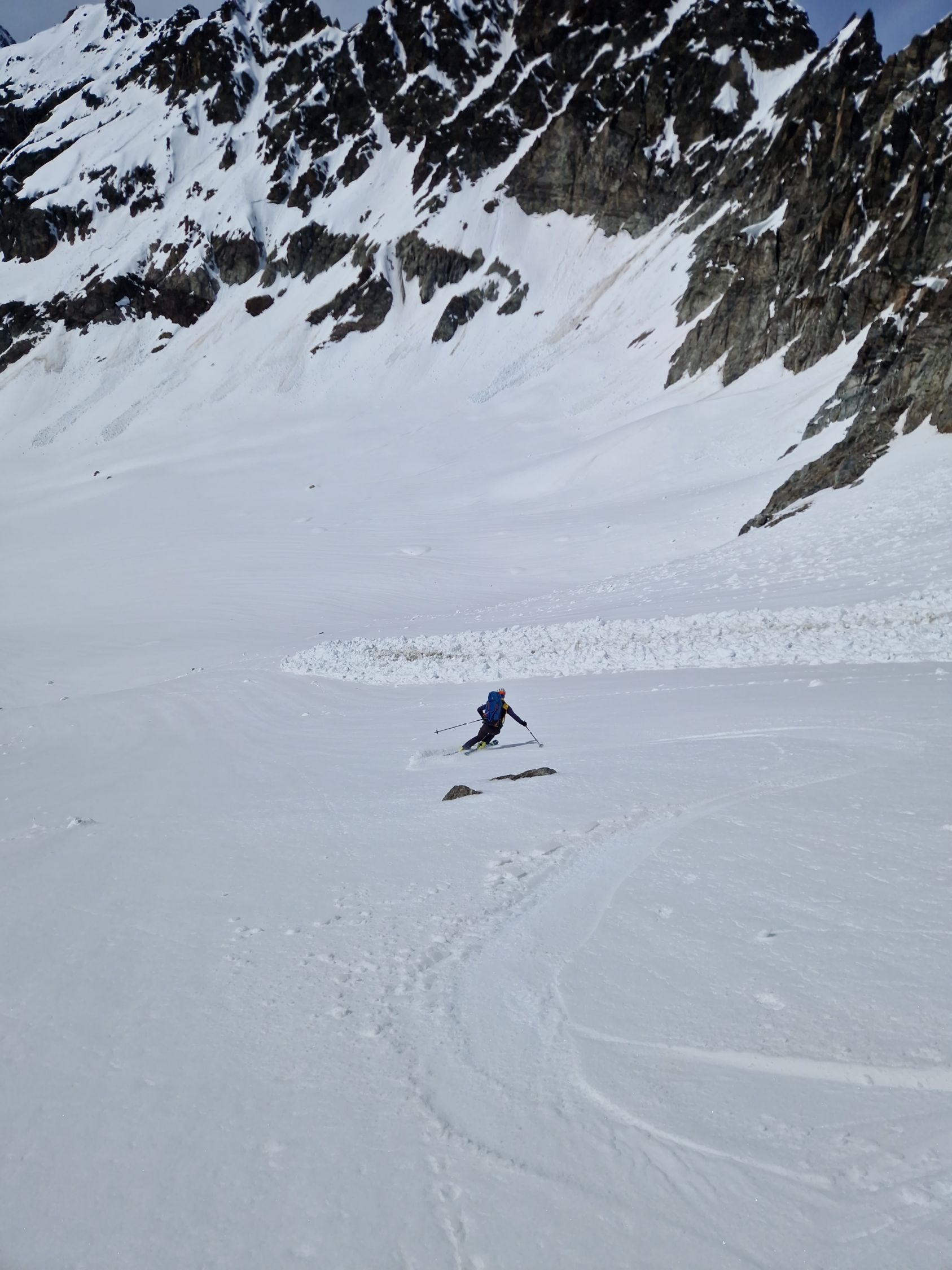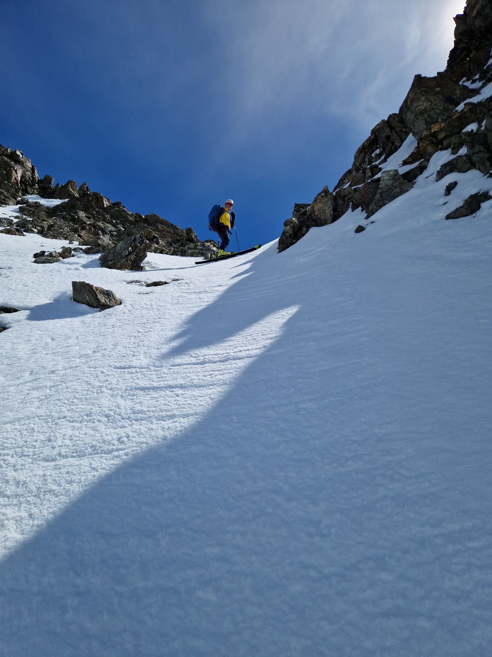 Heute waren wir vor der Abfahrt durchs Bieltal dann, dieses Mal aber bewusst, auf einem No-Name-Joch südwestlich der Rauhen-Kopf-Scharte, um neben der dort vorherrschenden Ruhe noch einen weiteren "glänzenden" Firnhang zu genießen.