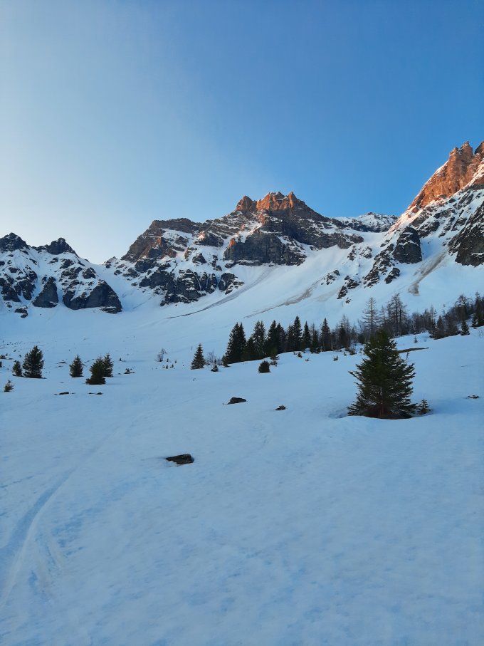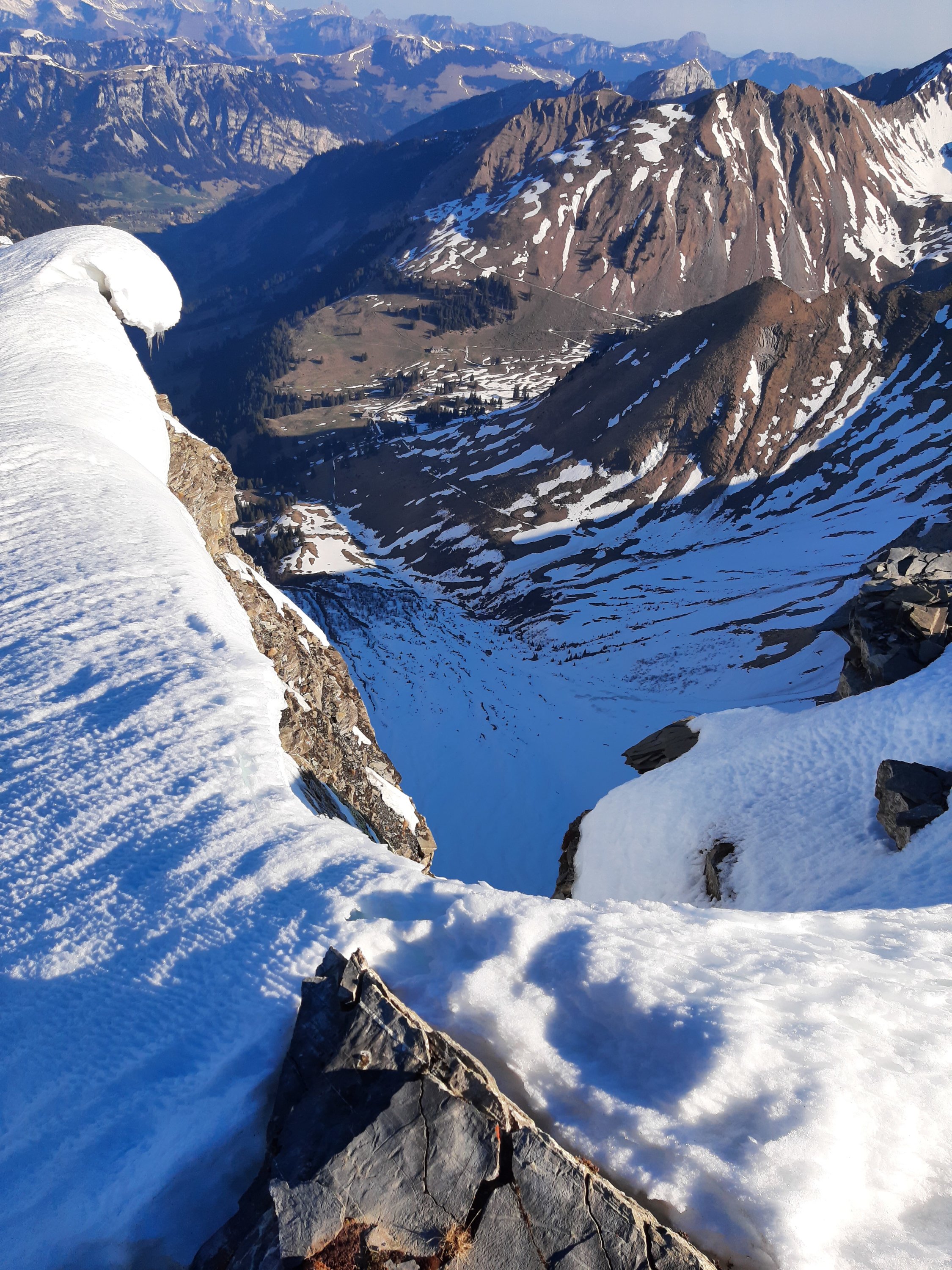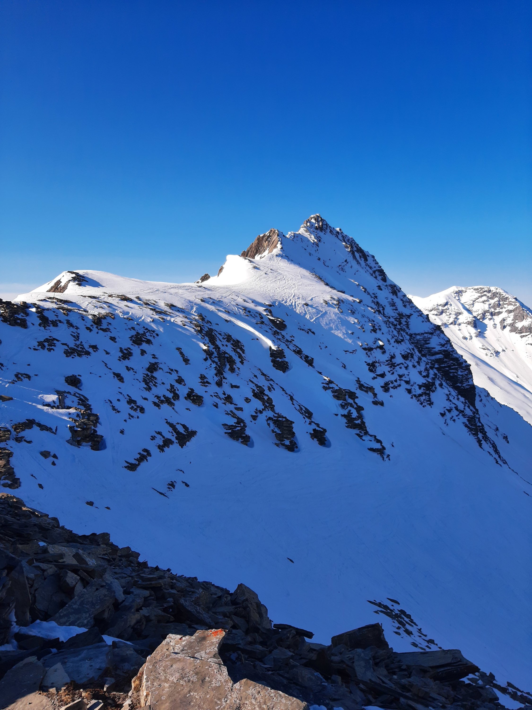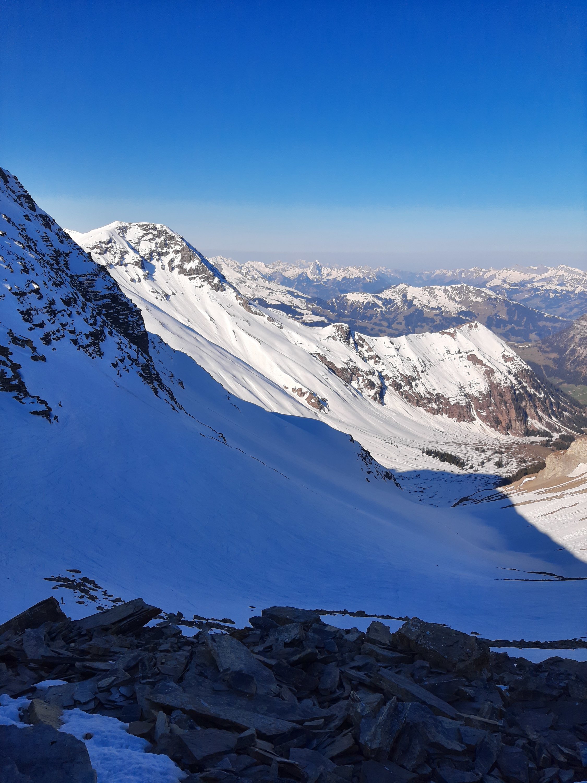 Aufstieg und Abfahrt durch das etwas ruppige Couloir okay, aber nicht zu unterschätzen. Stürzen nicht erlaubt im obersten Teil. Alter Lawinenkegel und einzelne Abbrüche müssen umfahren werden.