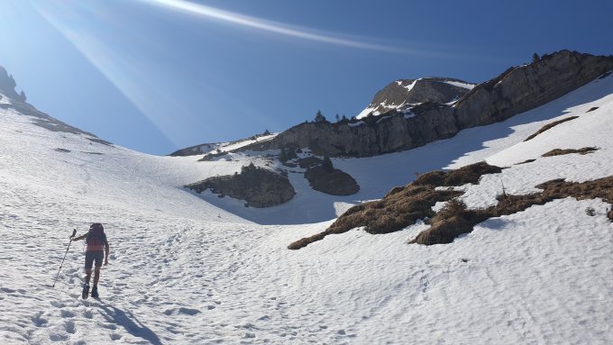haben die Tour zu Fuss unternommen. Keine Ski. Ab 1600 m nordseitig Schnee. Sind auf der Skiroute mit Steigeisen nordseitig zum Gipfel. Recht harter Schnee. Vom Gipfel auf dem Gratweg in die Lücke. Ab der Lücke nach Oberried schneefrei