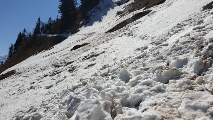 Ausstiegsrinne hat noch Schnee. Am Ausstieg ist noch eine kleine Wächte. Evtl. muss man mit einem Schneerutsch rechnen. Mit Steigeisen fühl man sich in der Rinne wohler.