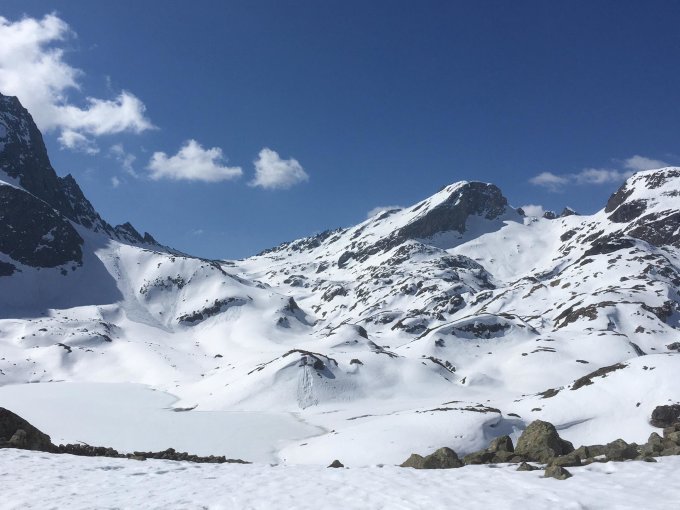 ausreichend Schnee ab La Veduta; See noch fest gefroren. Gipfelhang um 9.30 schön aufgefirnt.