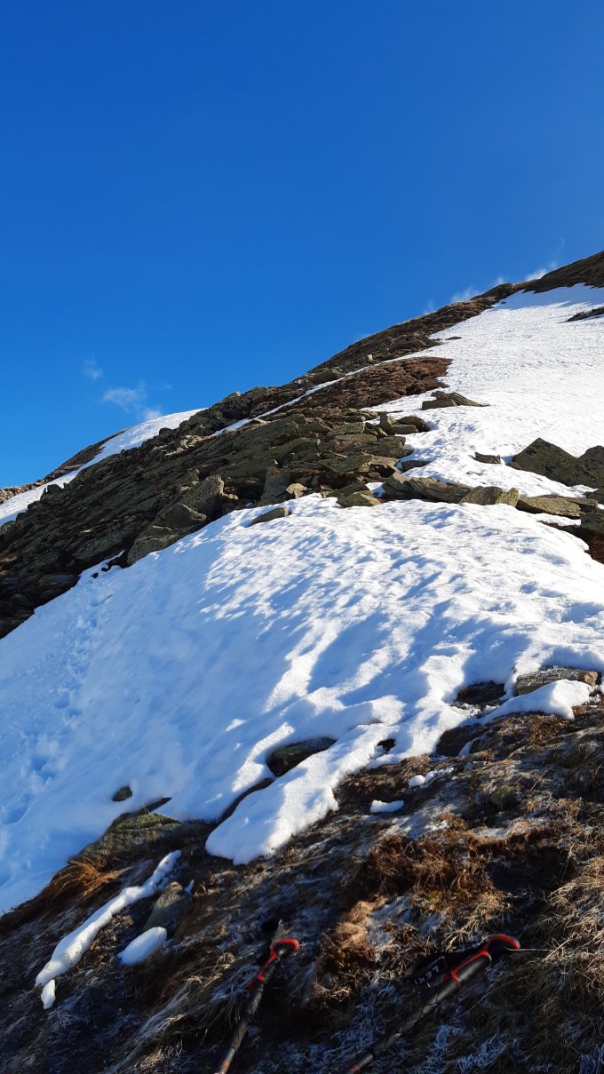 Dann mit geschlossener Schneedecke mehr oder weniger der Passstrasse entang zur Maighels Hütte. Ab dort noch bis ca. 80 Höhenmeter unter dem Gipfel schiebbar. Klar, Ski kann man über die eine oder andere Stelle tragen, wir haben es Dank der guten Abstrahlung zu Fuss gemacht.