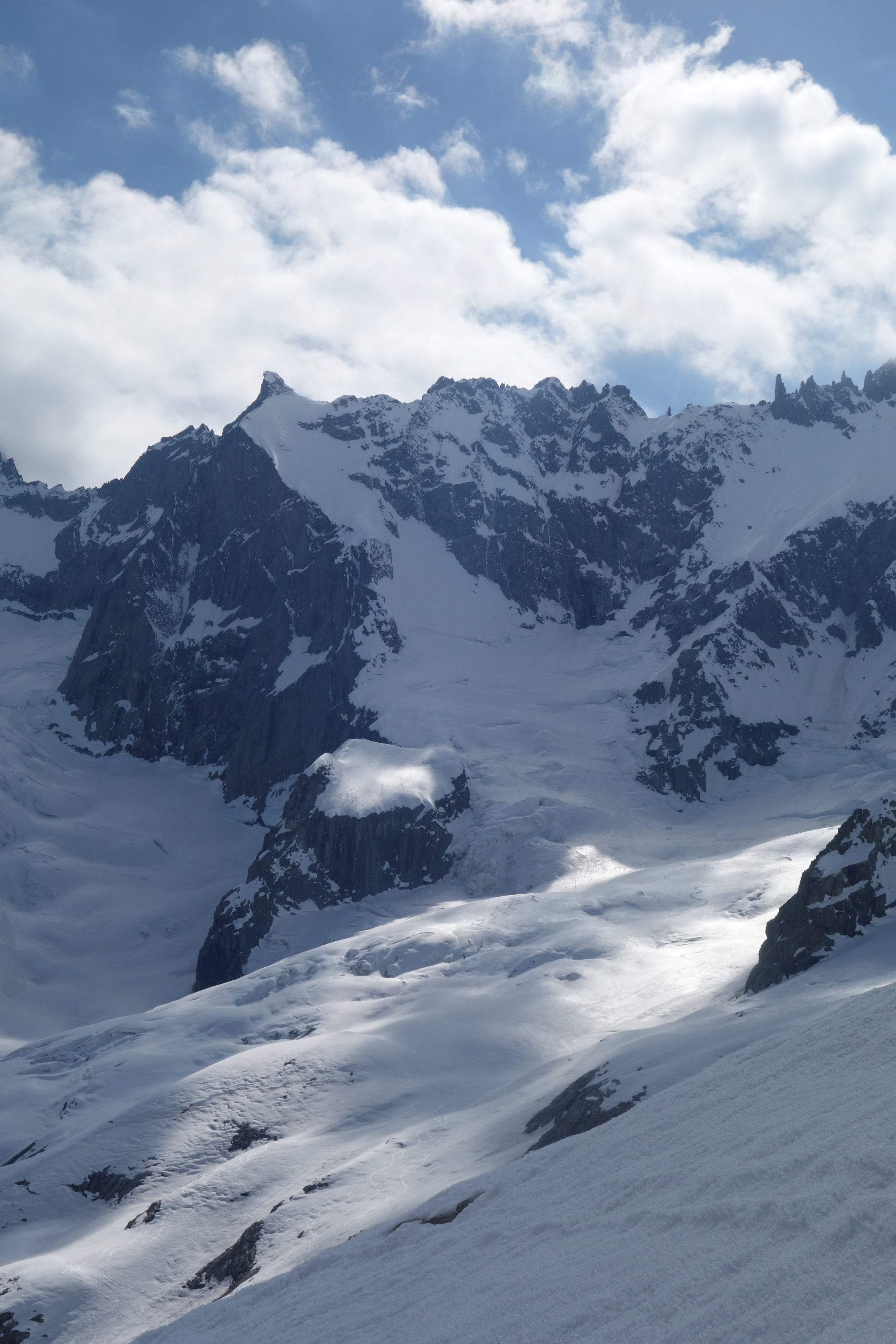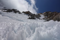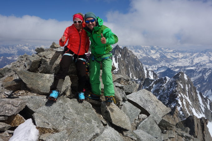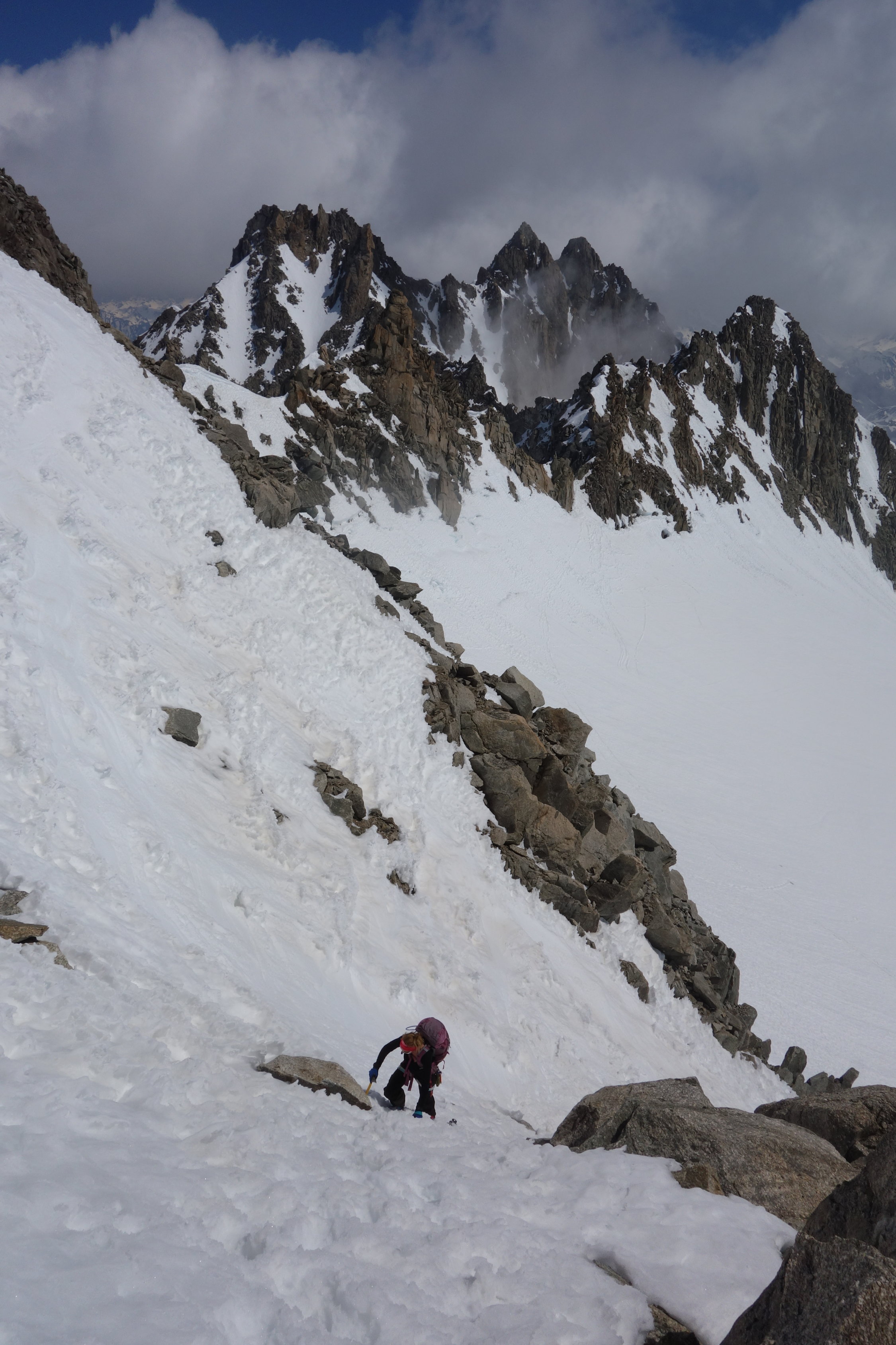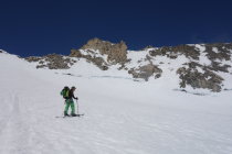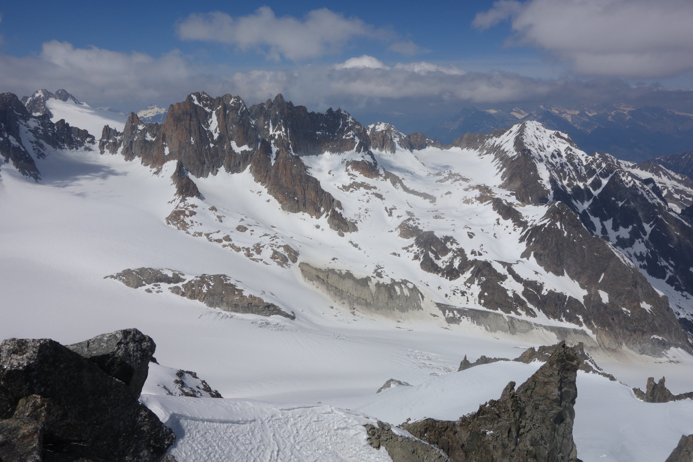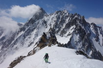 Nach dem Skidepot Bergschrund derzeit noch dick eingeschneit. Aufstieg mit Steigeisen und Pickel in tiefen Büsserschnee. Am Gipfel ca. 13:00. Herrliche Aussicht auf den mächtigen Mont Dolent, Tour Noir und den Saleinaz Gletscher mit seinen Bergen.