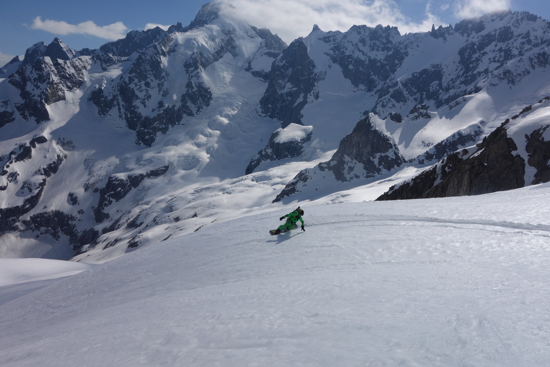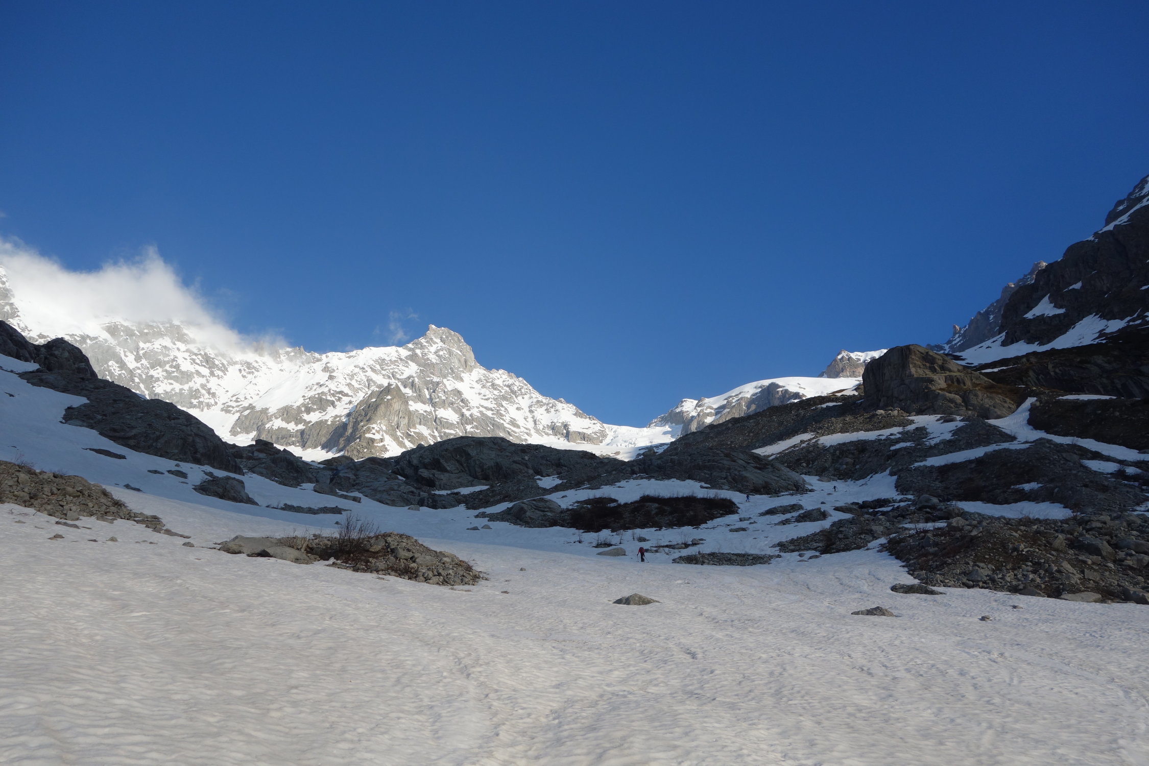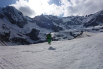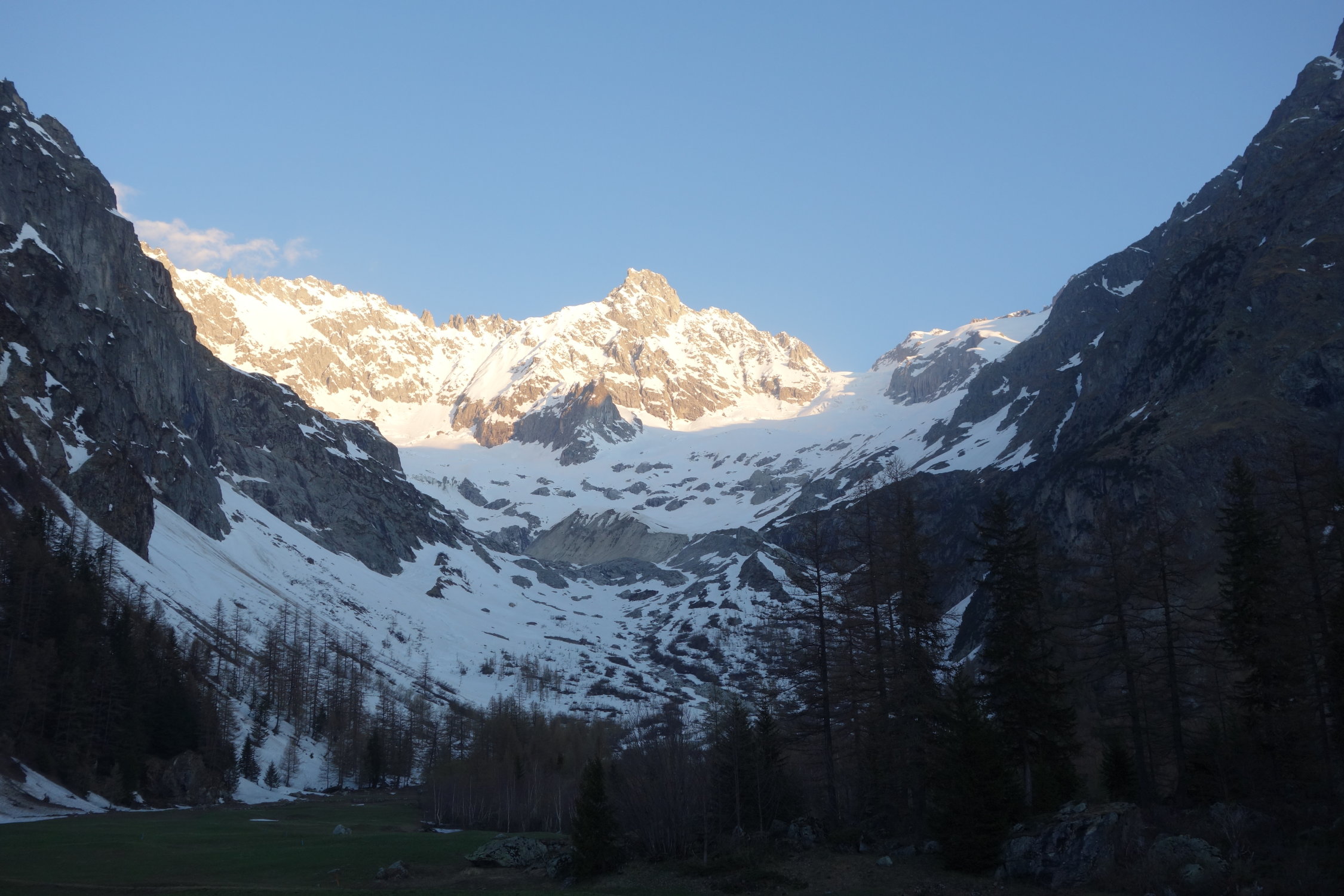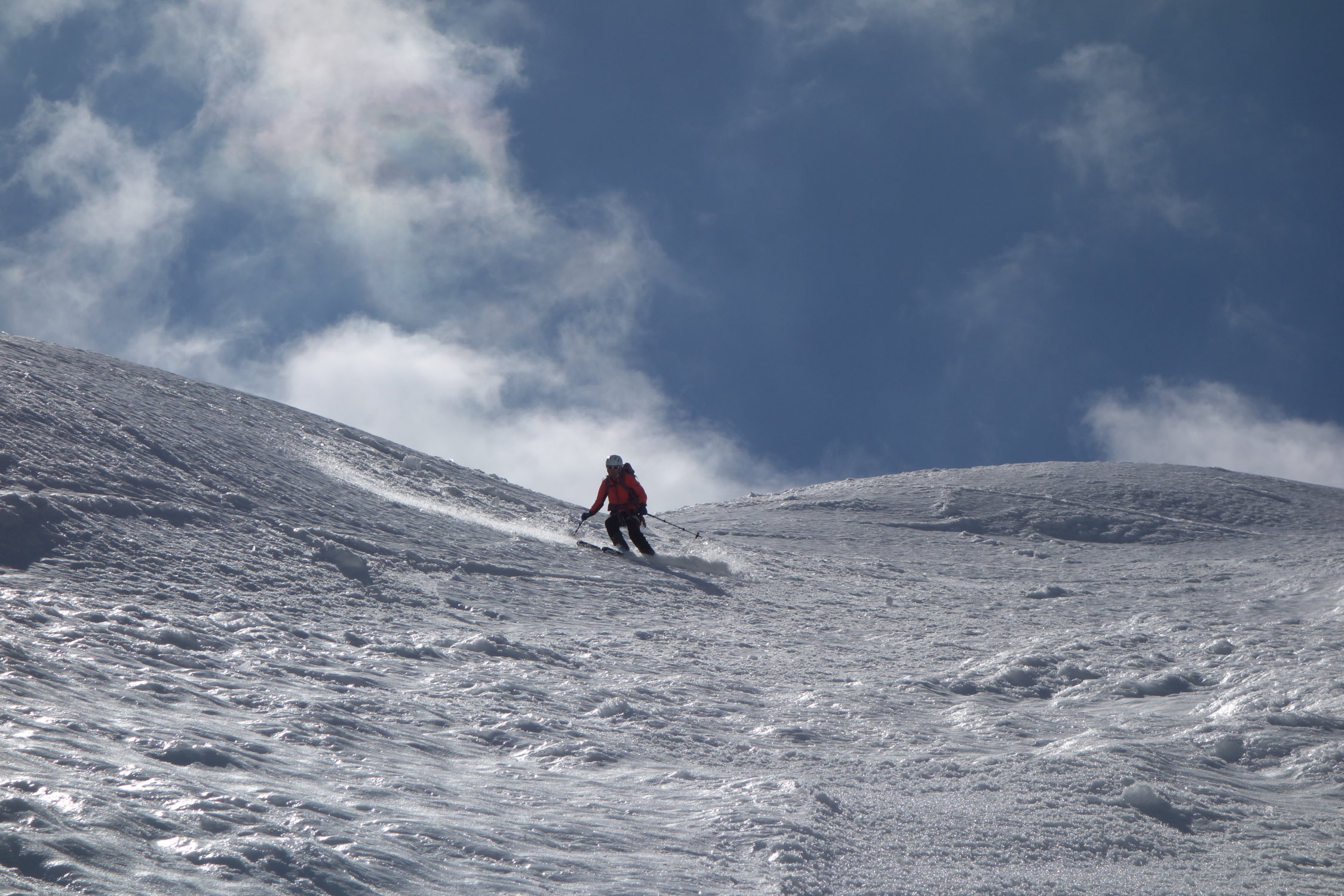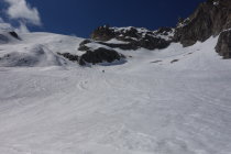 Abfahrt oben in schönen Sulz um 14:00, Oberfläche vom Schnee hat Wasserrinnen, dadurch wird man ab ca. 2600m einigermassen gut durchgeschüttelt. Trotzdem aussichtstechnisch wunderschöne unschwierige Tour. Aiguille de l'Amône wurde auch befahren und weisst viel Spuren auf. Eine 3er Gruppe kam ca. um 10:00 runter.