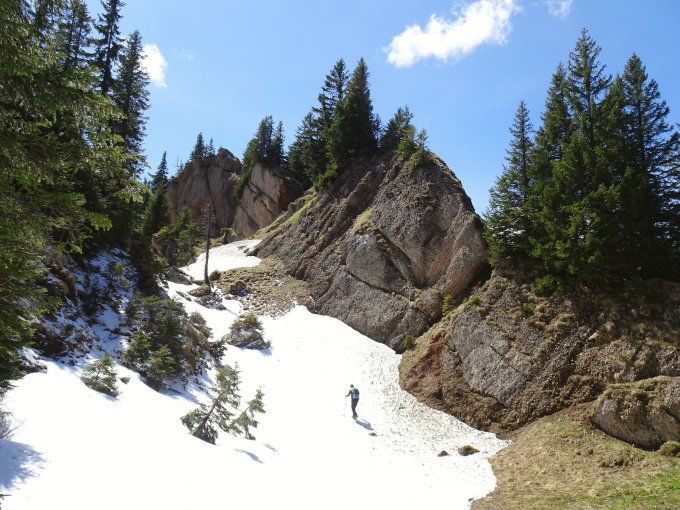 Nur an wenigen Stellen noch Altschnee (unterhalb der Gipfelleiter am Steineberg und in der nordseitigen Querung beim Stuibenaufstieg), hier aber gute Tritte. Ansonsten in schattigen Passagen wenig Neuschnee vom Vortag oder lehmig-rutschig, was etwas Vorsicht erfordert. Sonnseitig schon meist aper und trocken. Felsige und schmale Passagen sind weitgehend versichert.