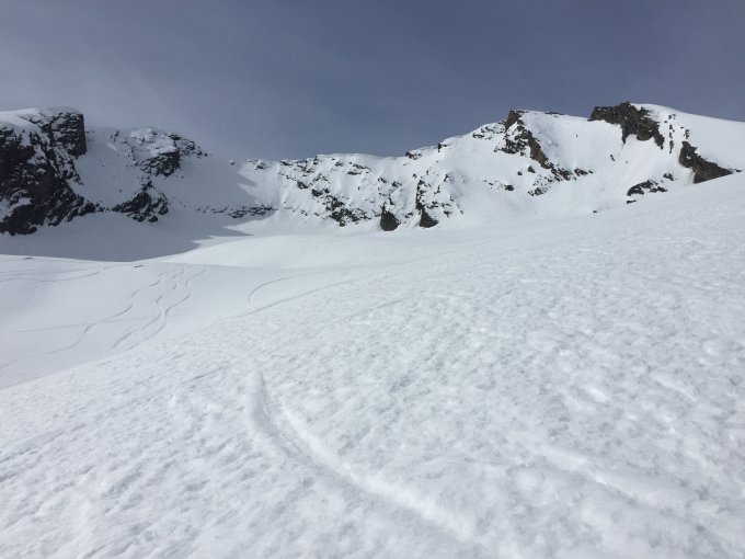 Durchgehende Schneedecke ab Juf. Vom Piotjoch zum Westgipfel Aufstieg über die Nordflanke etwas mühsam, die Ski müssen weiter oben abgezogen werden. Der Übergang vom West- zum Hauptgipfel entlang aperene Bereiche am Grat gut zu Fuss machbar.