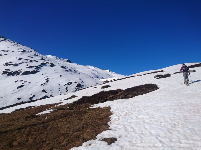Von Realp 7.30 Uhr per Velo bis Schluecht (ca. 1850 m) von dort mit den Ski weiter. Gute Abstrahlung und griffig zu gehen, Harscheisen nicht unbedingt nötig. Hatten den Gipfel für uns alleine, nur einige gefrässige Mäuse beim Steinmandli leisteten uns Gesellschaft. Abfahrt vom Gipfel kurz vor 12 Uhr war heute perfekt. Traumhafte Sulzhänge bis ca. 2100, von dort weicher und bremsiger mit Saharahstaub.