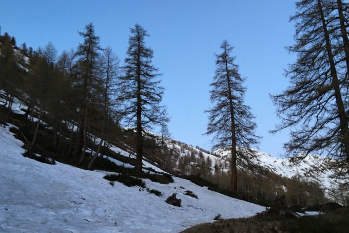 Noch 2 Tage gut (bei nächtlicher Abstrahlung), dann kaum mehr. Der Schnee ist schon jetzt eher knapp, d.h. erst ab ca. 1750 m wirklich durchgehend. Die ca. 15 Min. Skitragen auf schönem Wanderweg durch einen phantastischen Lärchenwald empfanden wir bei einer so tollen Tour als absolut o.k.
