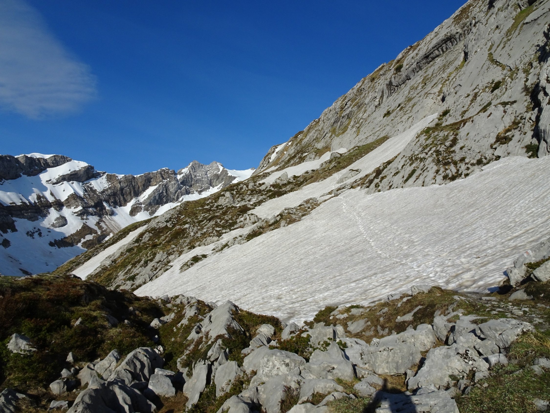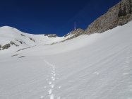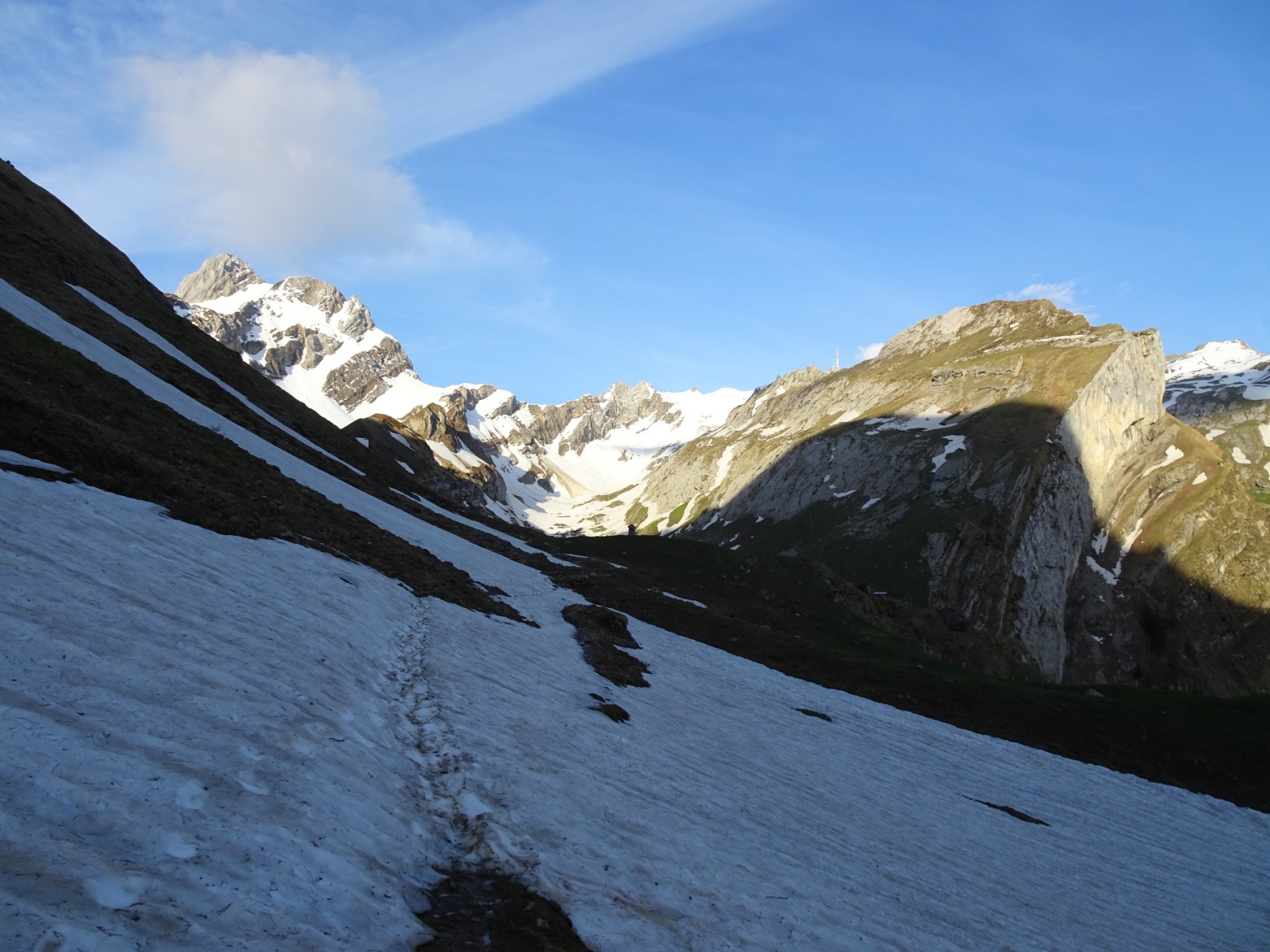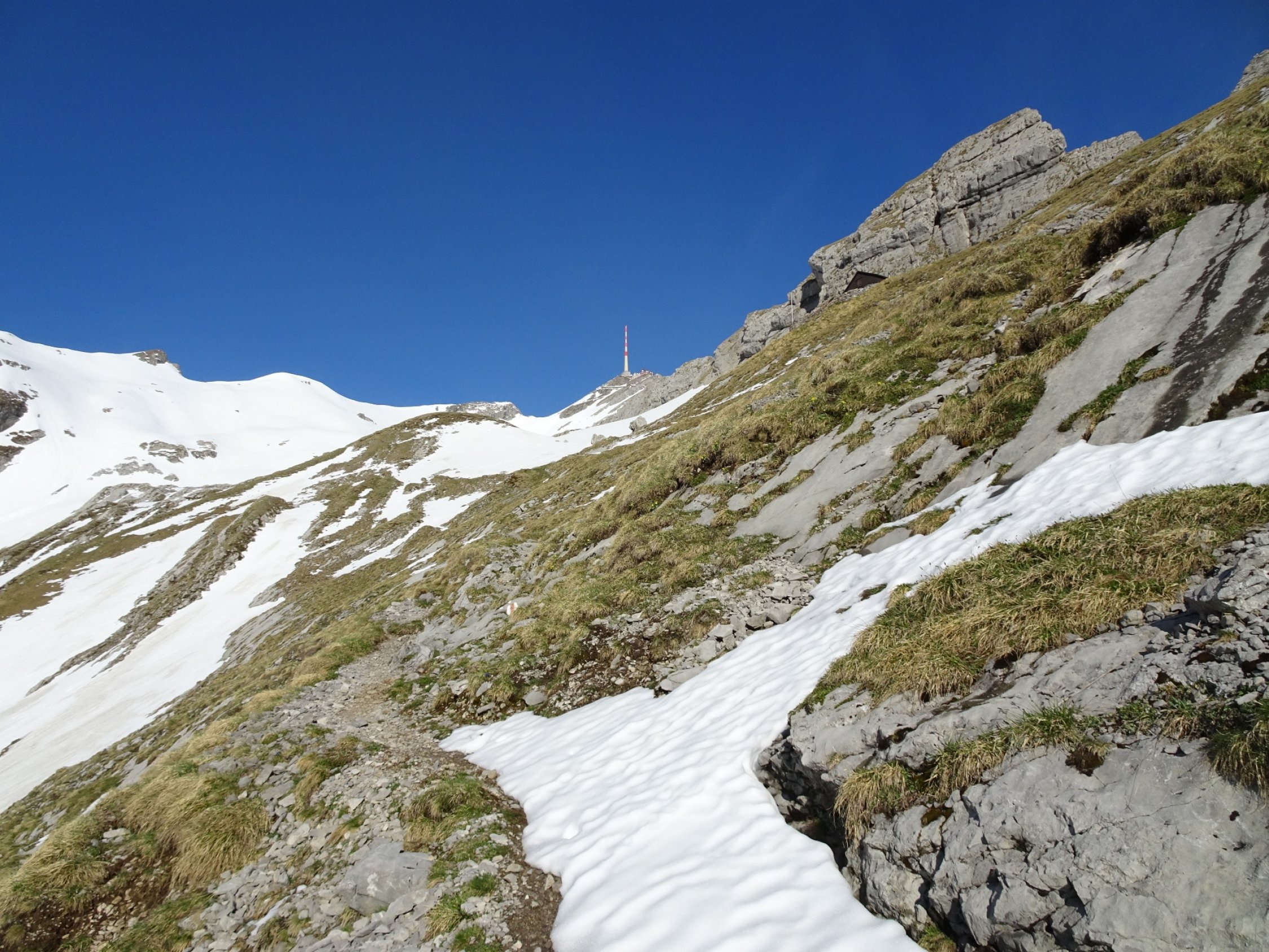 Weg vom Seealpsee (Understrich) ist bis kurz vor der Meglisalp schneefrei, aber Seile sind noch nicht eingezogen! Dann auf ein paar Restschneefelder weiter zur Meglisalp. Oberhalb der Meglisalp bis auf ca. 1‘800 Meter mit ein paar Ausnahmen schneefrei. Dann grössere Schneefelder bis zur Wagenlücke-Hütte. Ab der Hütte dann auf geschlossener Schneedecke zum Gipfel.