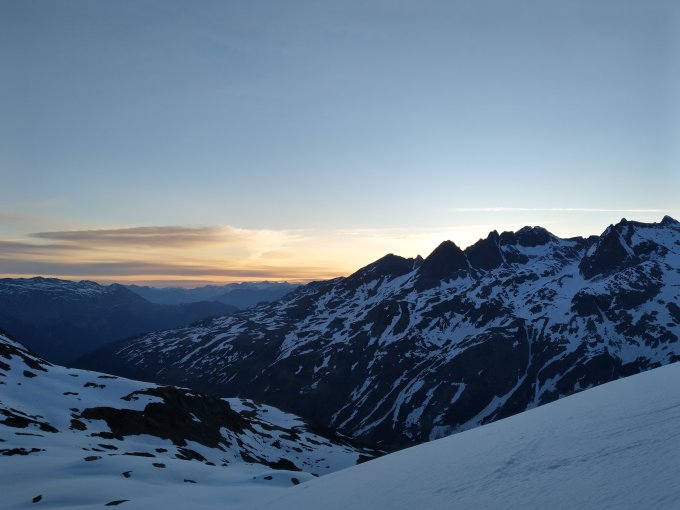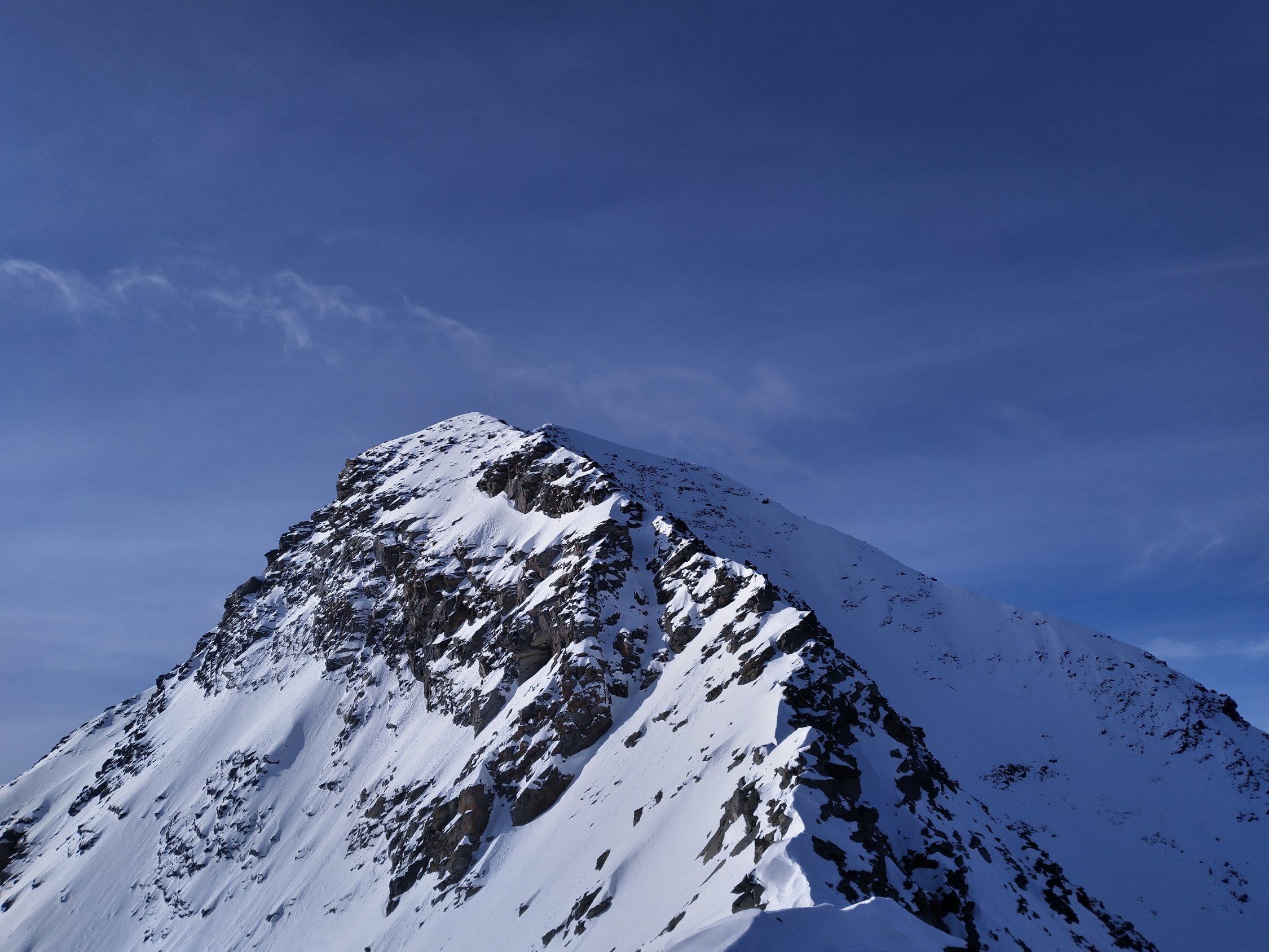 Start um 5:30 bereits ohne Stirnlampe. Mit Skiern bis unterhalb des Nordgratanfangs (in hartem Firn) und dann aufgeschnallt am Rucksack dem Grat folgend bis zum Gipfel.