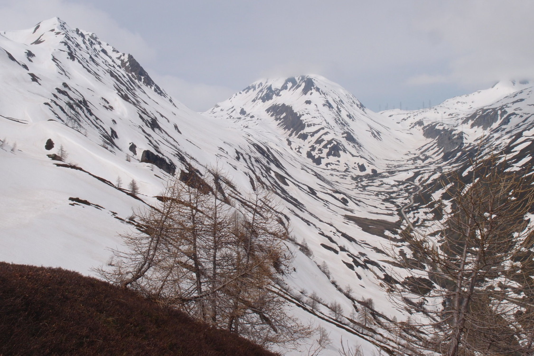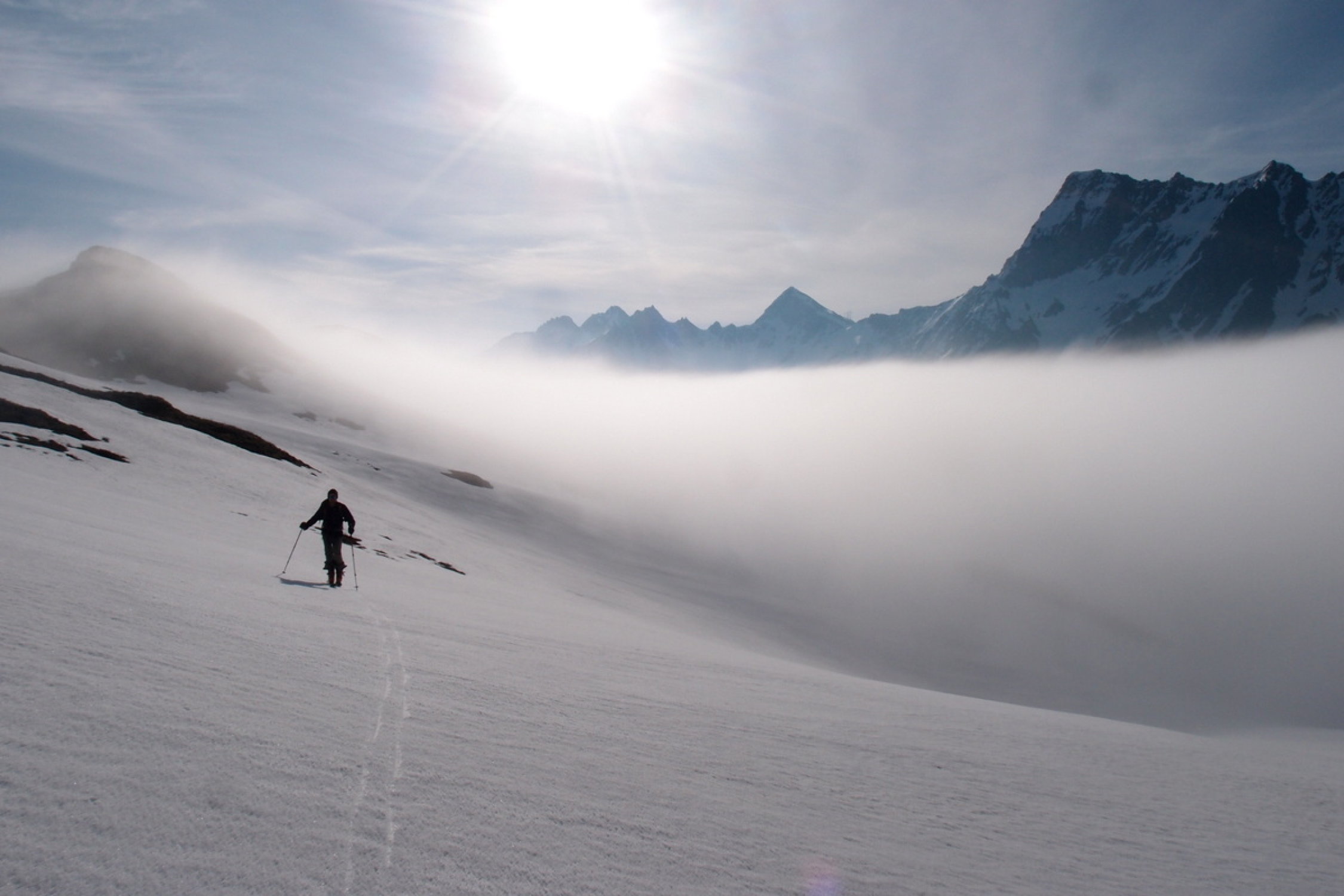 Nebelbänke schoben sich über den Pass und hoben sich während des Aufstiegs immer höher bis fast auf Gipfelniveau. Sehr unerwartet tasteten wir uns ab dem Pass bis etwa Einfahrt Valle rossa durch die nebelige Landschaft.