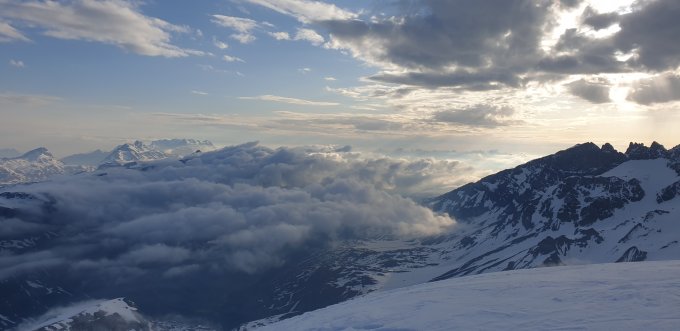 Aufstieg auf der Claridenroute via Chammlijoch, das Wetter am Morgenfrüh noch unsicher, bis Iswändli gute griffige Spur, dann musste ich die Ski kurz tragen, weiter auf Hartemschnee zum Chammlijoch, leichte Nebelschwaden zogen auf, die Abfahrt in Richtung Schärhorn war leicht wellig, der Aufstieg zum Gross Schärhorn dann bei besten Verhältnissen bis zum Skidebot, beim Fussaufstieg zum Gipfel waren gute Trittspurenn vorhanden, die letzten Meter am Grat waren aper mit einer Platte, dort war es auch schon einfacher bei mehr Schneeauflage, die Abfahrt durch die Südflanke war schön Sulzig, bei der Chammlilücke immer noch Hardgefrohrener Firn, an den Schattenstellen hinab nach Chammlialp leider etwas Decklig, dann aber wieder Nassschnee bis zum Klausenpass, es war sehr mühsam von der Chammlialp bis zum Pass, es hat schon viele längere apere Stellen, Abfahrt über Chammlijoch via Iswändli währe sicher Skifahrerisch die besser Wahl.