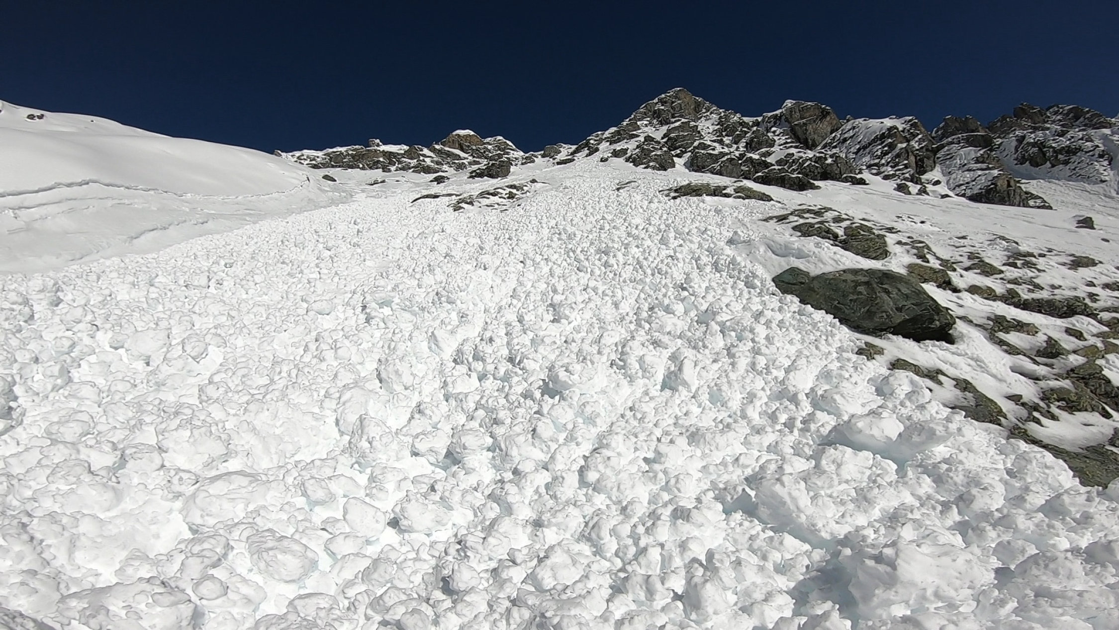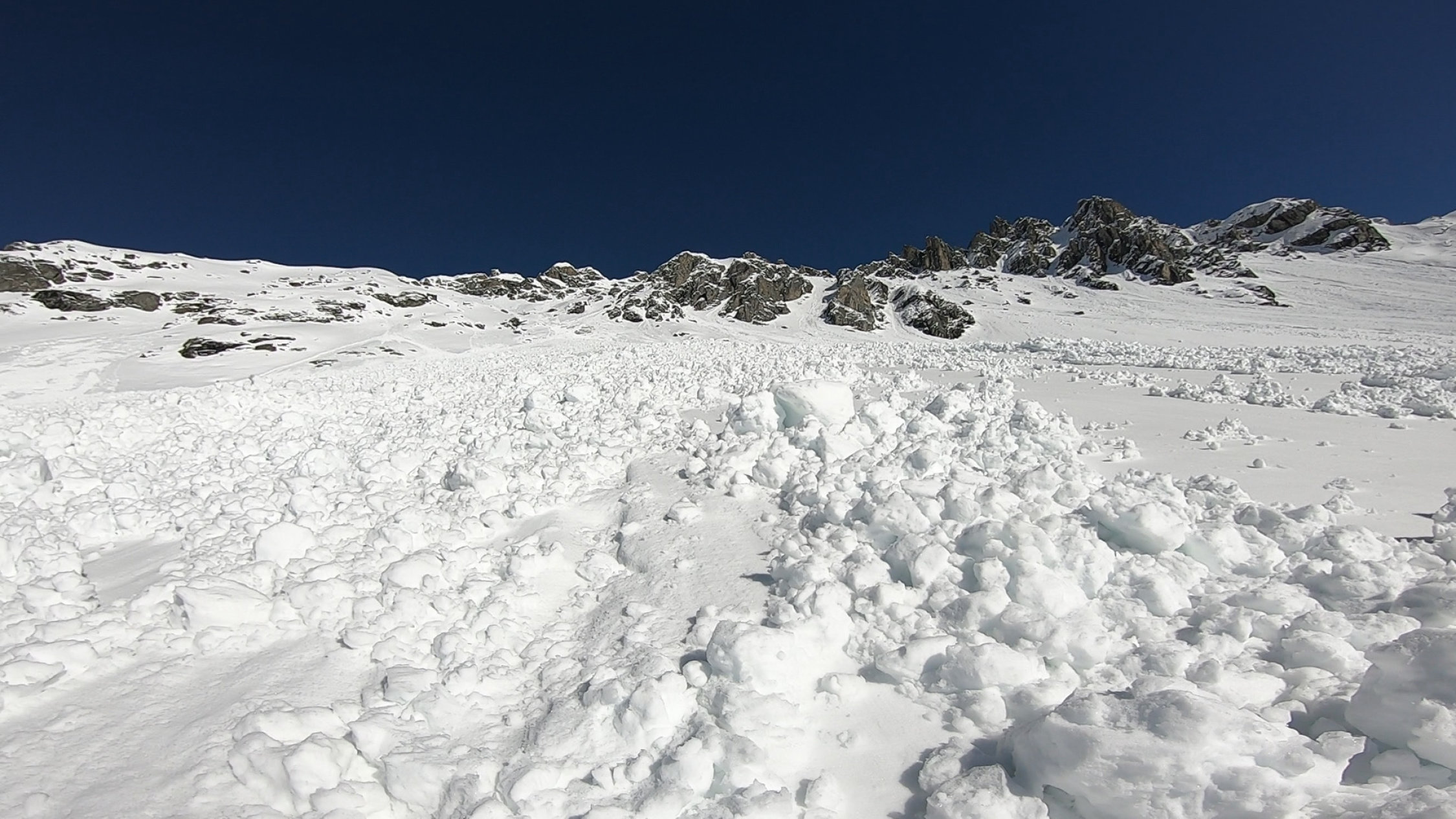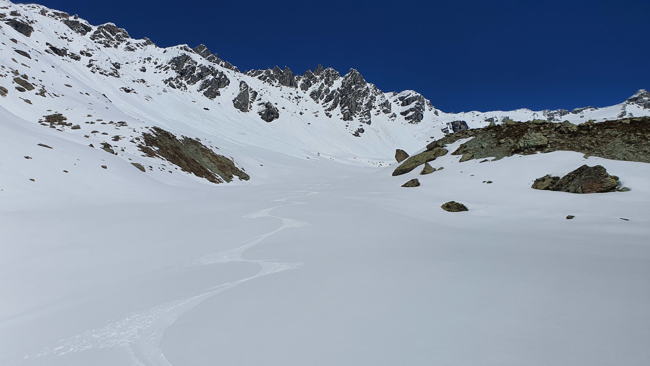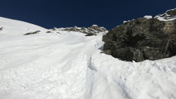 Die Steile Südflanke ist komplett mit Lawinenkegeln gefüllt sodass man nur im Stapf voran kommt .