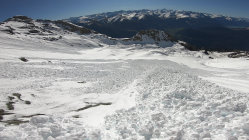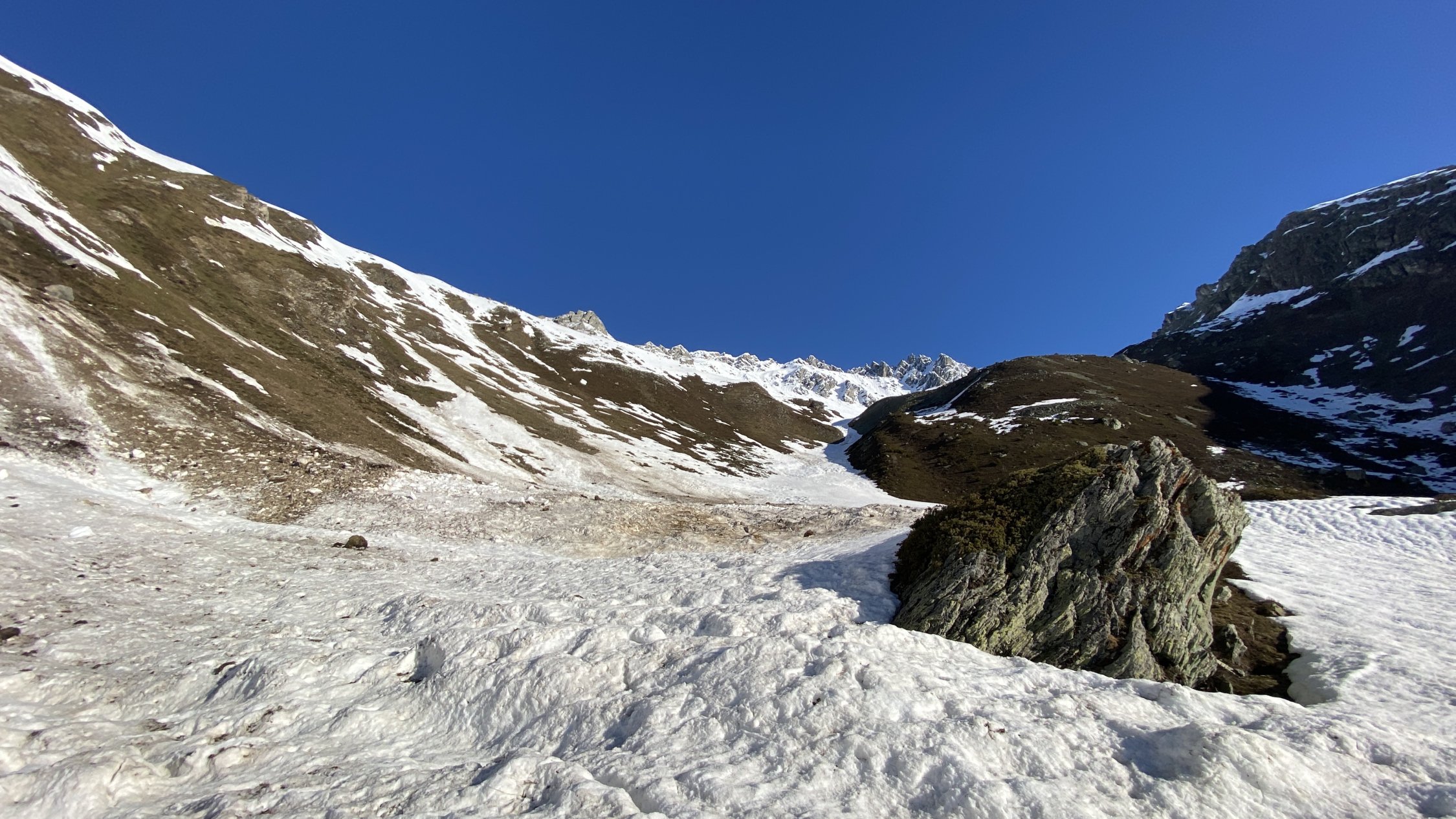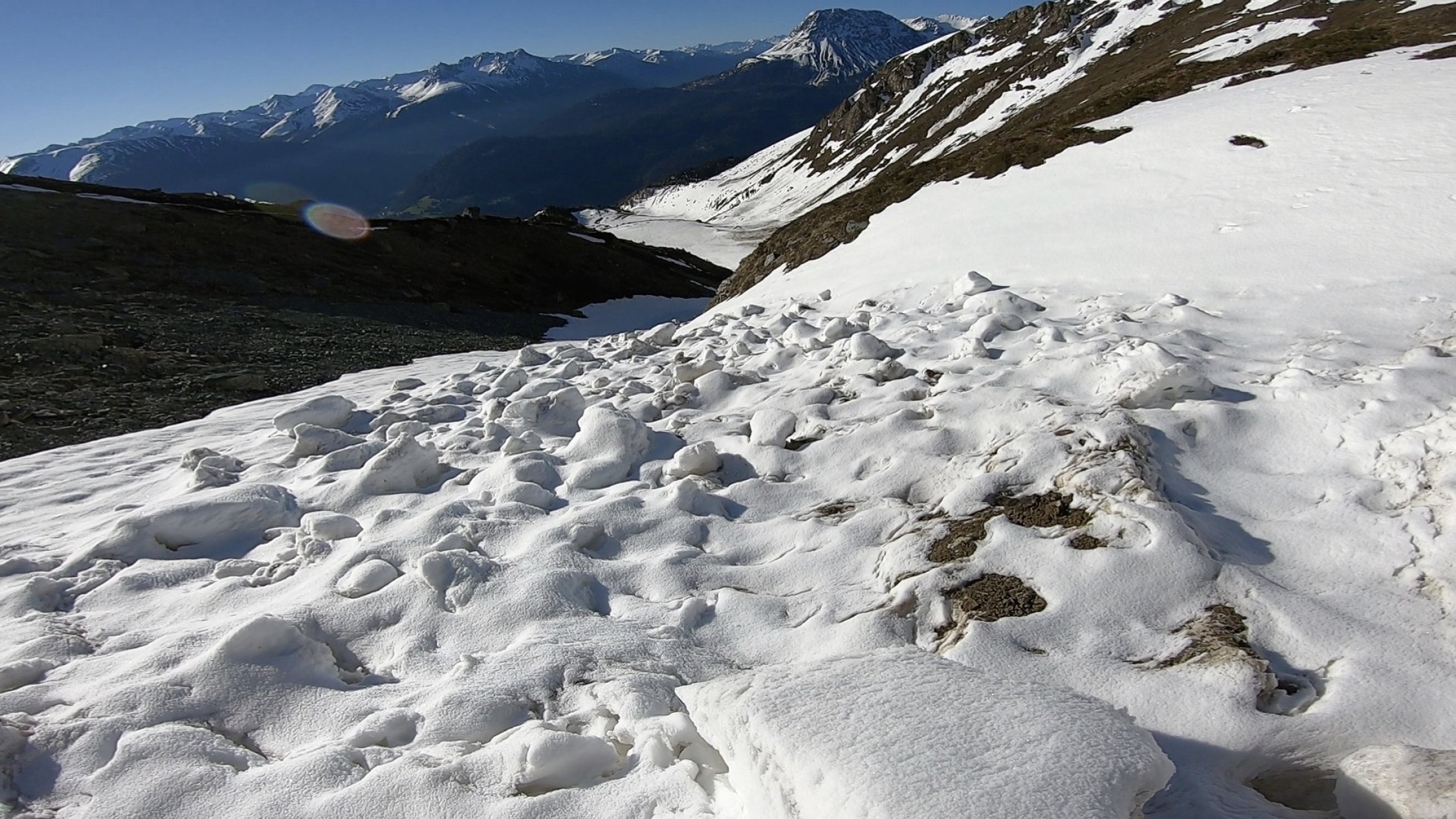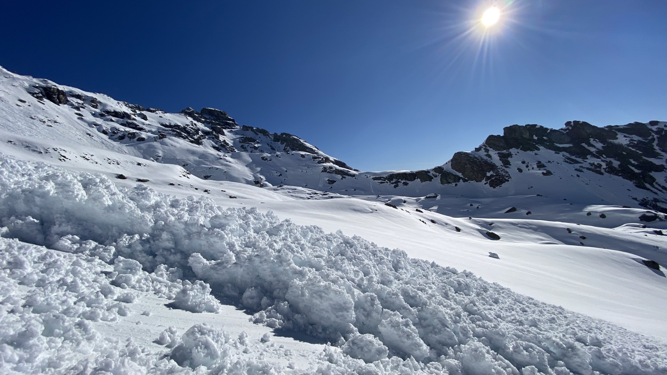 Die Steile Südflanke ist komplett mit Lawinenkegeln gefüllt sodass man nur im Stapf voran kommt .