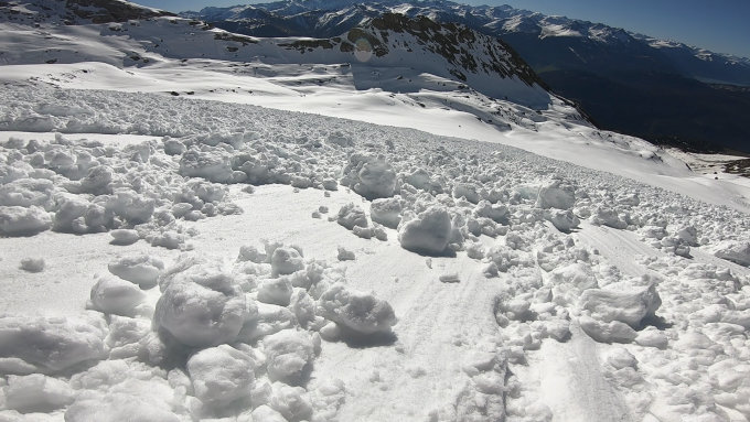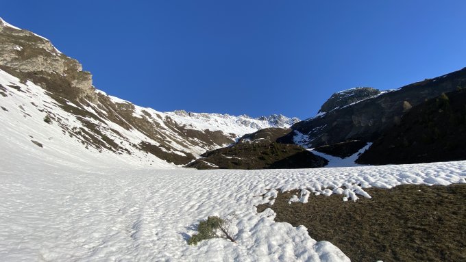 Die Steile Südflanke ist komplett mit Lawinenkegeln gefüllt sodass man nur im Stapf voran kommt .