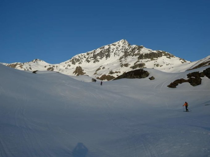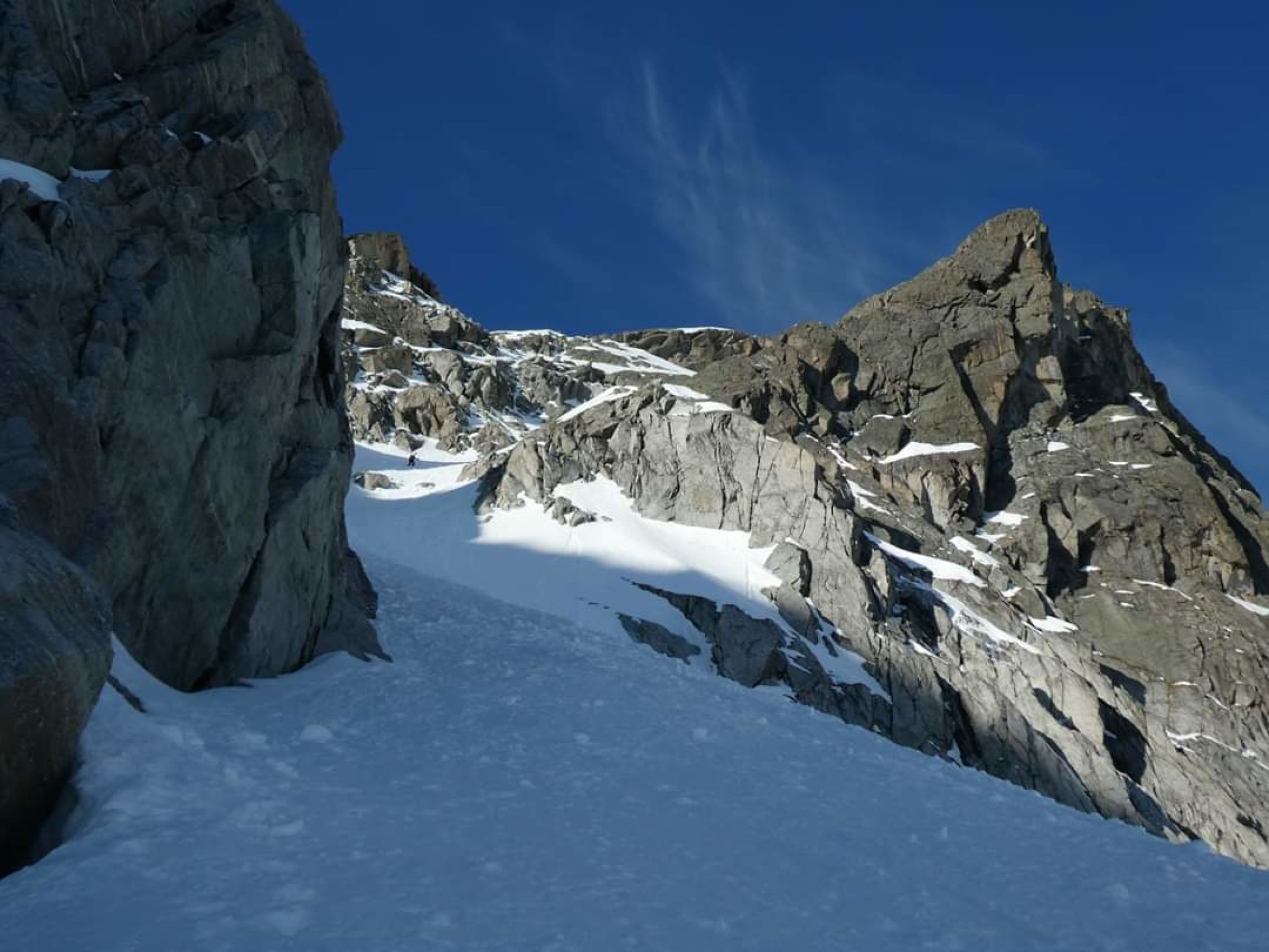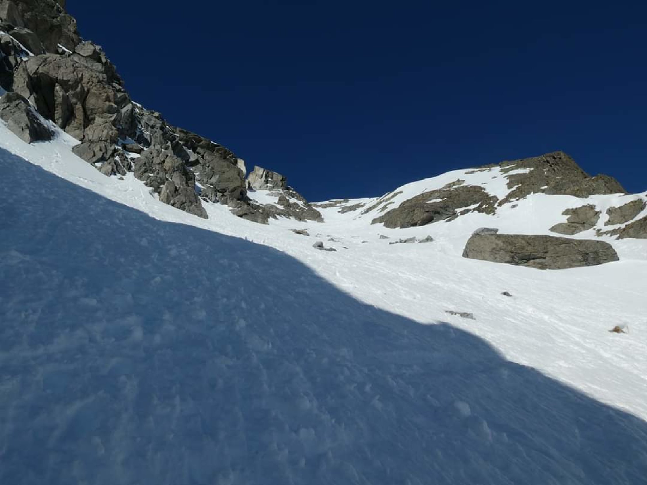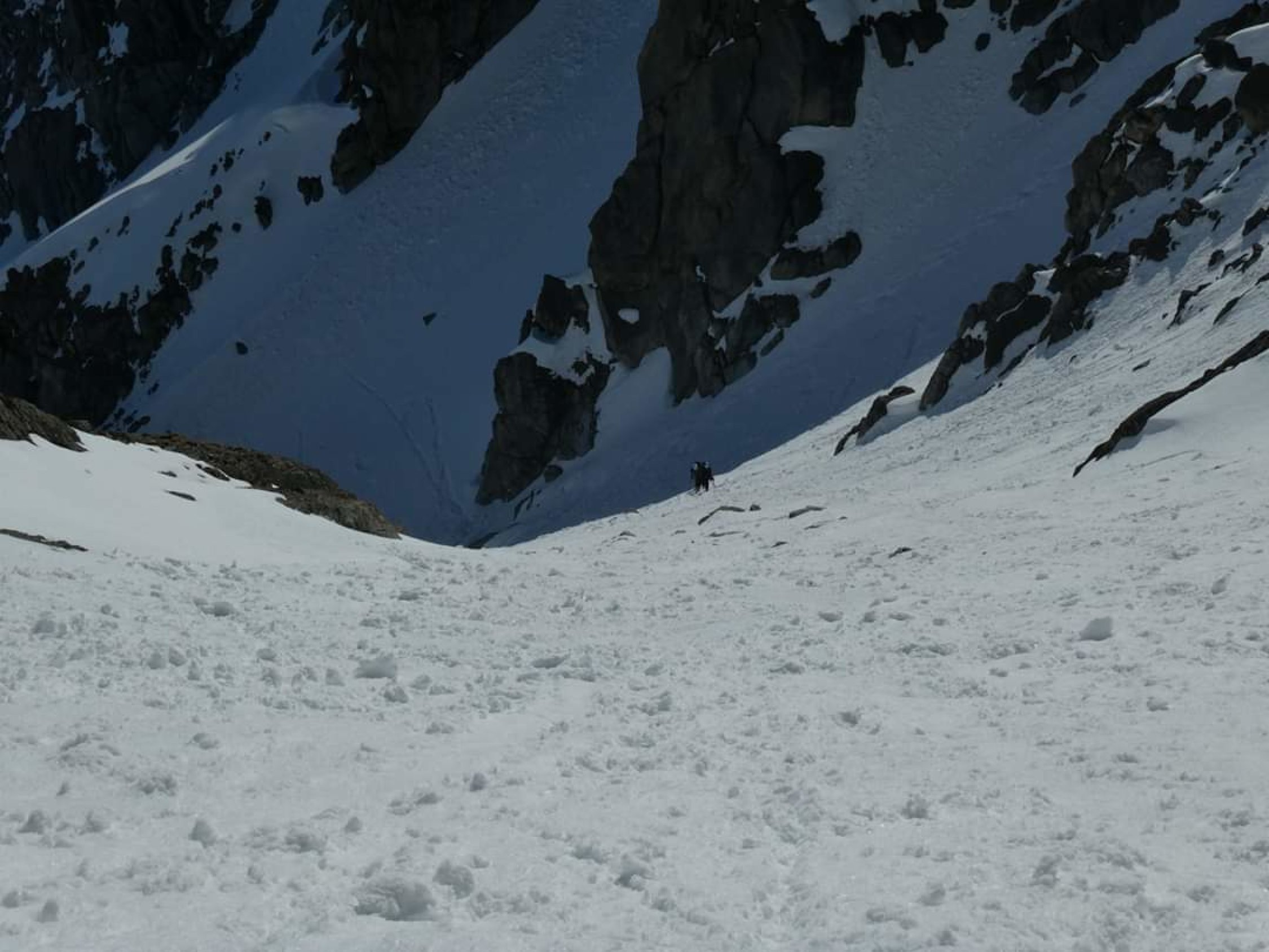 Gute Verhältnisse, im NE-Couloir tiefer, weicher Schnee.