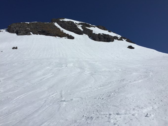 Bis auf eine kurze Stelle für die Tour noch eine geschlossene Schneedecke. Gipfelaufstieg ab Skidepot mit gutem Trittschnee. Für die Abfahrt war der Schnee perfekt aufgesulzt.