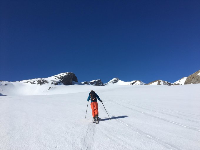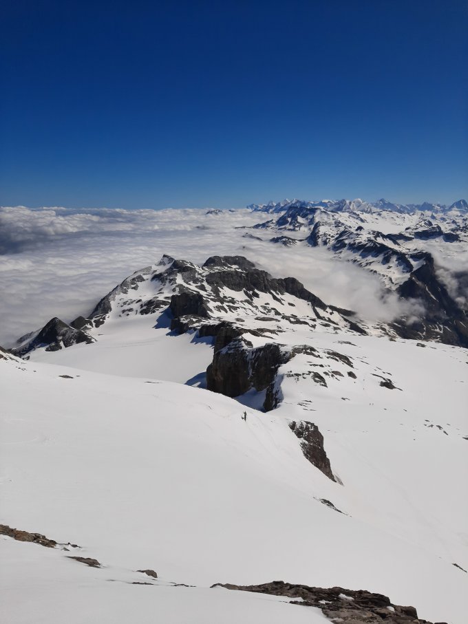 Start Iffigenalp um 6h mit Fussmarsch bis Punkt 1825. Route nicht via Wanderweg Egge, sondern links dem Bach/Tal folgend. Danach bis auf drei Ausnahmen bei geschickter Routenwahl bis zum Gipfel Schnee. Der See kann nicht mehr überquert werden. Viele habe die Variante links rum gewählt, auch hier muss ein kurzes Steinfeld passiert werden. Wir sind rechts rum (sichere Variante) bis zur Alp und ab da hat es dann Schnee. Abfahrt 11h, war heute bis 2400müM super, darunter eher eine Stunde zu spät.