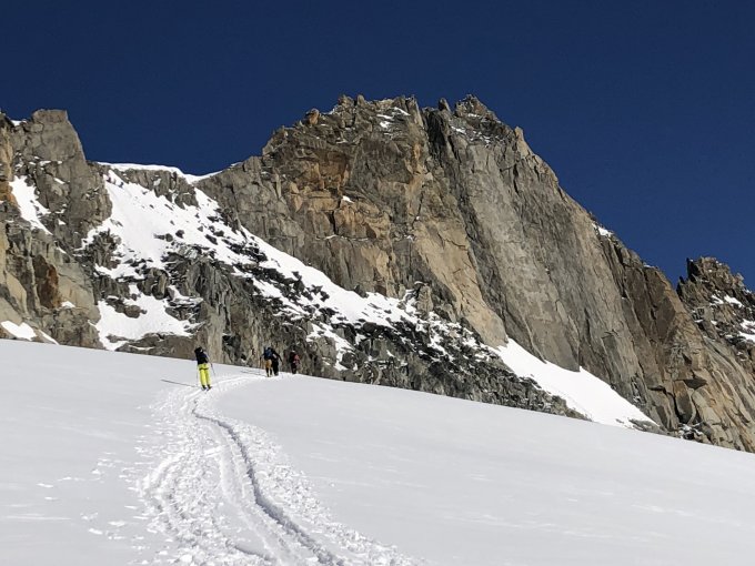 Vom Hotel Tiefenbach muss nur wenig marschiert werden (ca. 20-30 Minuten je nach Routenwahl). Ganz oben hatte es ein wenig geschneit. Auf dem Nordgrat pulveriger Schnee. Seit heute gibt es wieder eine gute Spur. Der Schnee zwischen den Tritten und dem Nordgrat war schon am Morgen um 08:30 Uhr sehr weich. Beim Abstieg um ca. 11:30 Uhr war es aber nicht wesentlich weicher. Oben hatte es für die Abfahrt angenehme Schneeverhältnisse unten wurde der Schnee sehr schwer.