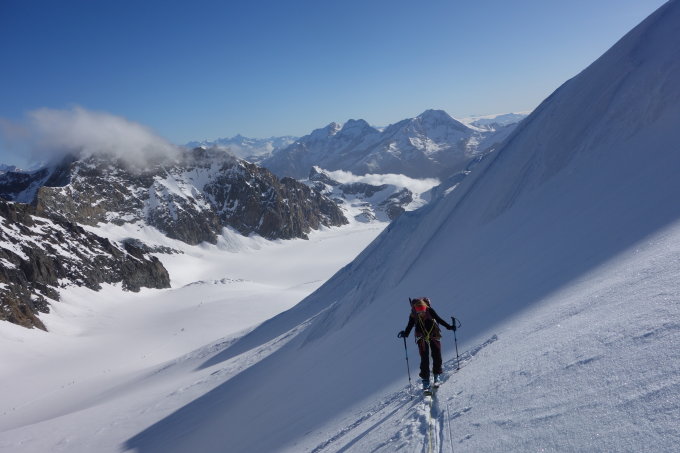 Insgesamt gute Bedingungen im Gebiet, Rimpfischhorn, Fluchthorn wurde auch begangen. Im Zustieg zur Britaniahütte muss man die Ski derzeit ca. 30 min tragen Bahn fährt keine, Zustieg ca. 3.5-4h.