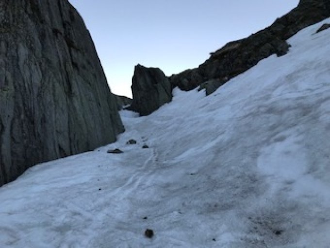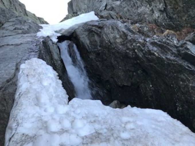 Um es kurz zu machen: die Saison auf dieser Route geht früh zu Ende. Musste heute Morgen um 0610 knapp vor dem Ausstieg aus dem Hauptcouloir aus Sicherheitsgründen abbrechen, siehe Bild. Leider war die Schneeschicht weder dick noch stark genug und der Gärstenbach ist zum Vorschein gekommen. In wenigen Tagen wird sich der Bach an diversen Stellen auch im unteren Couloirbereich seinen Lauf suchen.